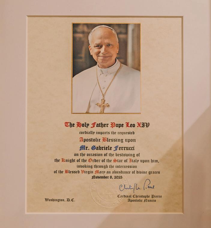 To mark the occasion of Ferrucci receiving the Star of Italy title, Msgr. Stephen Doktorczyk helped arrange a surprise apostolic blessing upon Ferrucci of “an abundance of divine graces” from Pope Leo.