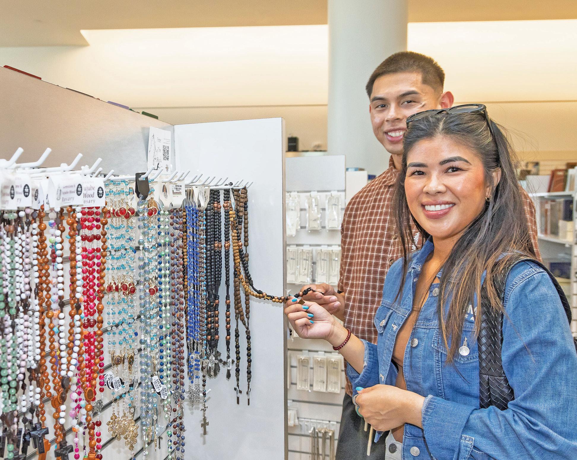 PAULETTE MASKERINO AND KYLE FARRO PAUSE FOR A PHOTO AS THEY BROWSE ROSARIES AT THE CHRIST CATHEDRAL SHOP.