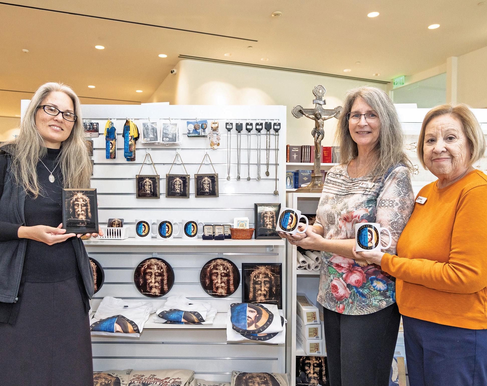 DANIELLE TAYABAS, LEFT, BETTY ARNOLD AND VIVIAN GOMEZ SHOWCASE SOME OF THE NEW ITEMS ON DISPLAY AT THE CHRIST CATHEDRAL SHOP, LOCATED NEAR THE ENTRANCE ON THE FIRST FLOOR OF THE RICHARD H. PICKUP CULTURAL CENTER ON THE CHRIST CATHEDRAL CAMPUS. PHOTOS BY ALAN WENDELL/DIOCESE OF ORANGE