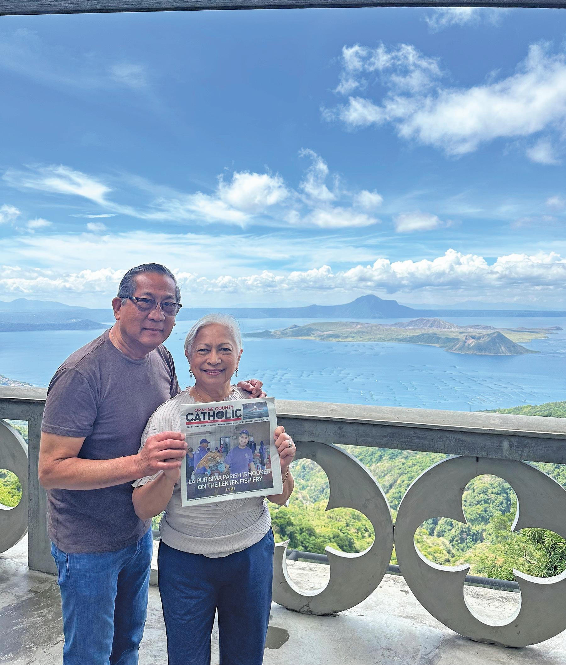 Rey and Daisy Genaldo hold a copy of OC Catholic during a visit to Taal Lake in Tagaytay, Philippines. Taal Volcano, which is an active volcano, can be seen in the background.