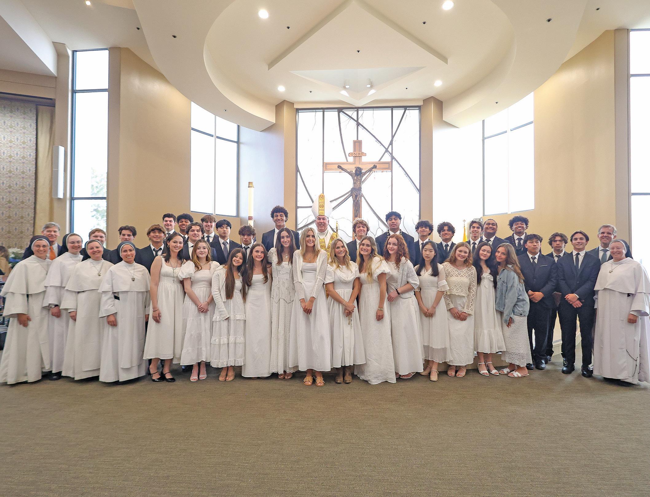BISHOP TIMOTHY FREYER BAPTIZES A JSERRA STUDENT AS PART OF THE OCIA (ORDER OF CHRISTIAN INITIATION FOR ADULTS) PROGRAM. PHOTO COURTESY OF JSERRA CATHOLIC HIGH SCHOOL