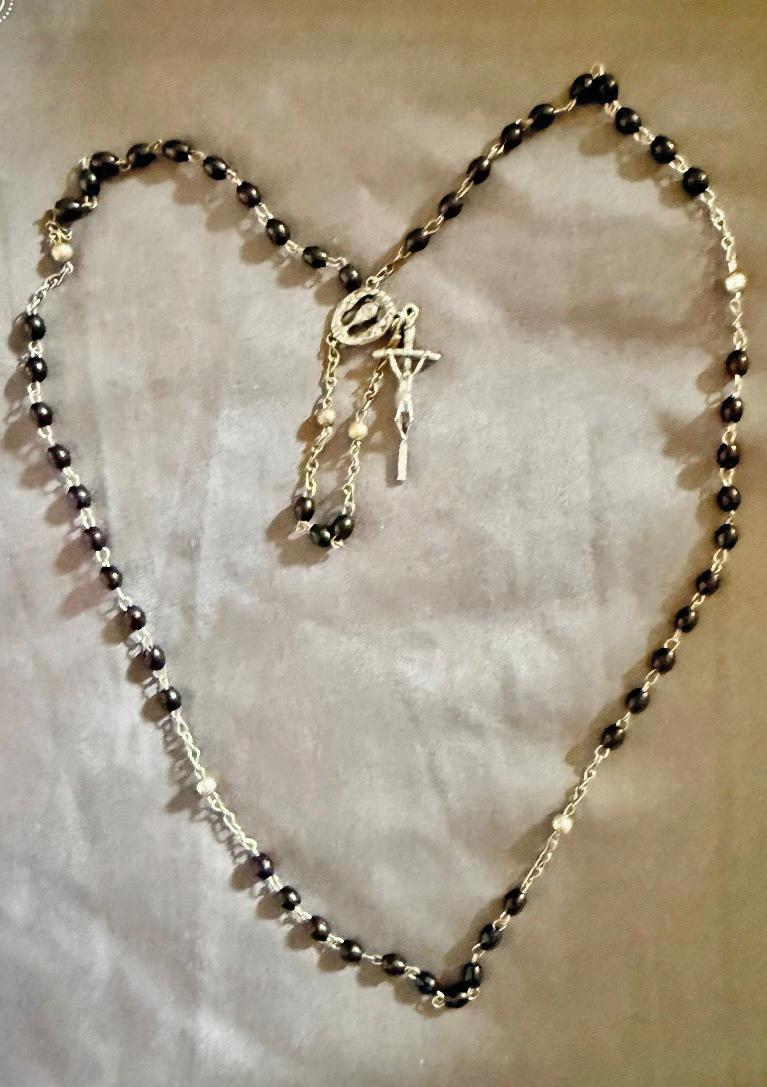 I wanted to share a picture of my mom’s Rosary Beads. My mother Mercedes Mercado has been praying the Rosary since she was a young girl. Whenever we were on a road trip we would pray the Rosary together. To this day my mother and father pray the Rosary at least three times a day. My mother keeps the black beaded Rosary under her pillow.