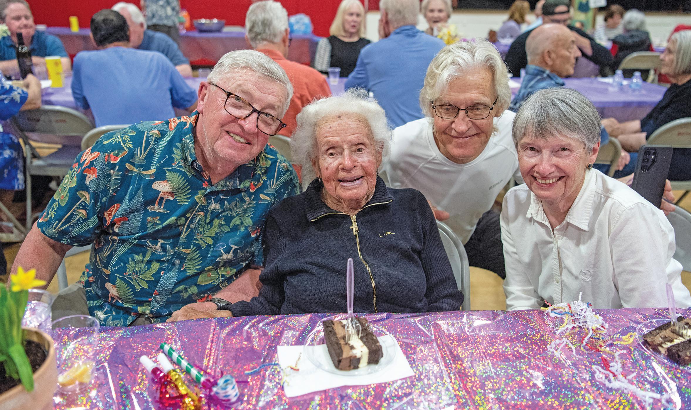 CLAIR MUSHEN OF SAN JUAN CAPISTRANO SITS WITH HER KIDS, DAVID MUSHEN, JIM MUSHEN AND MARY ANN MUSHEN, FROM LEFT, WHILE CELEBRATING HER 104TH BIRTHDAY AT A MISSION BASILICA PARISH FISH FRY. PHOTOS BY JEFF ANTENORE/DIOCESE OF ORANGE