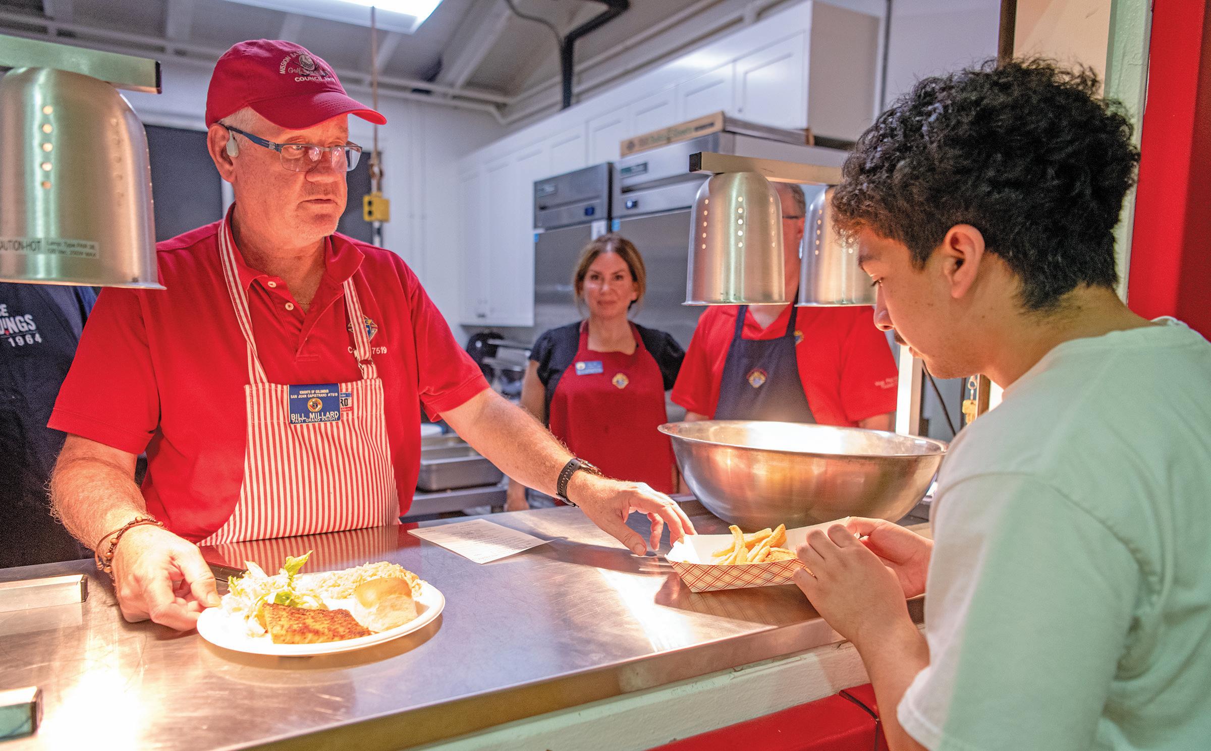 BILL MILLARD, LEFT, VOLUNTEER CHEF, AND PAST GRAND KNIGHT FOR THE KNIGHTS OF COLUMBUS, HANDS AN ORDER TO VOLUNTEER FOOD RUNNER JAYDEN REYES DURING A MISSION BASILICA PARISH FISH FRY. PHOTOS BY JEFF ANTENORE/DIOCESE OF ORANGE
