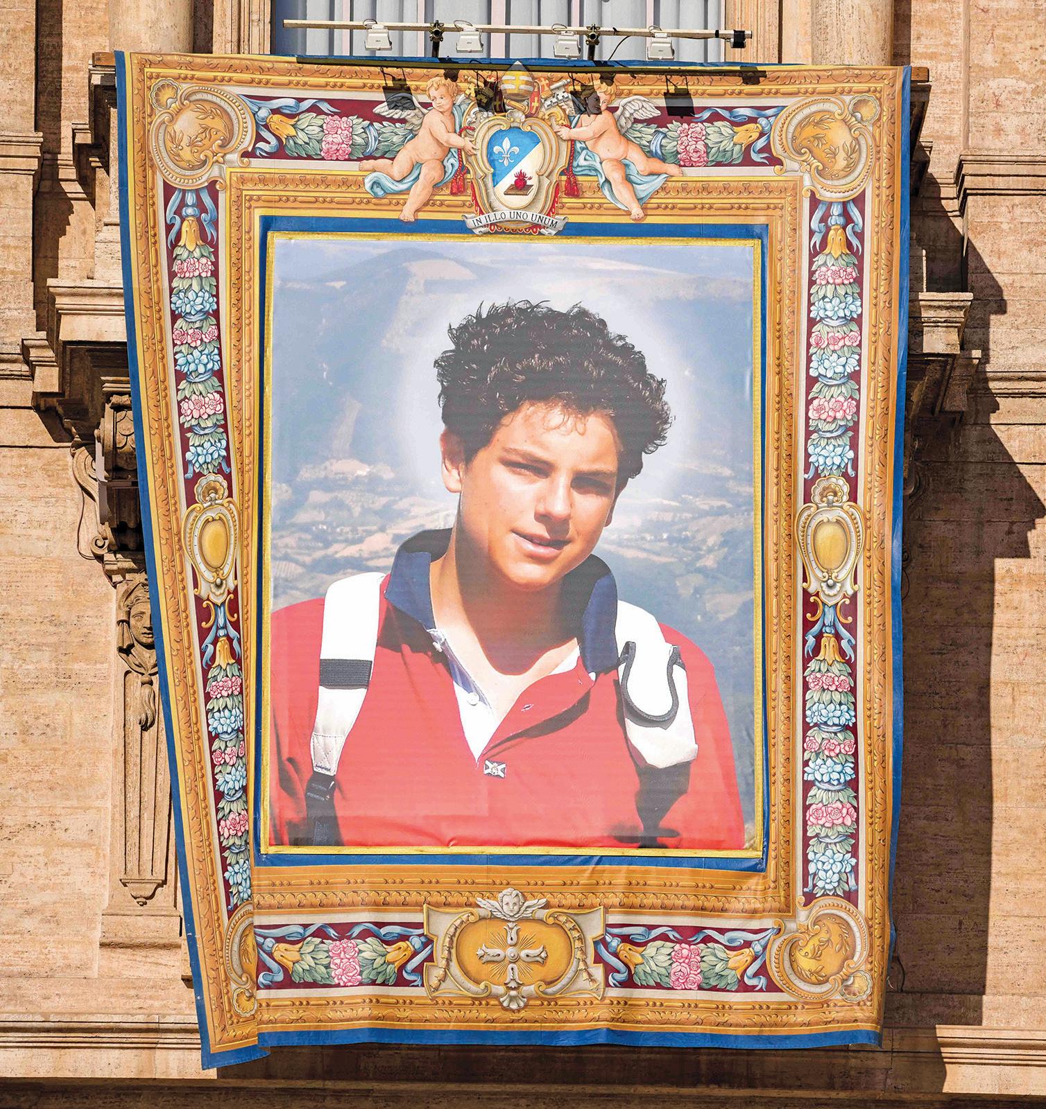 A TAPESTRY DEPICTING ST. CARLO ACUTIS HANGS FROM THE FACADE OF ST. PETER’S BASILICA DURING THE MASS FOR HIS CANONIZATION AT THE VATICAN SEPT. 7, 2025. CNS PHOTO/LOLA GOMEZ