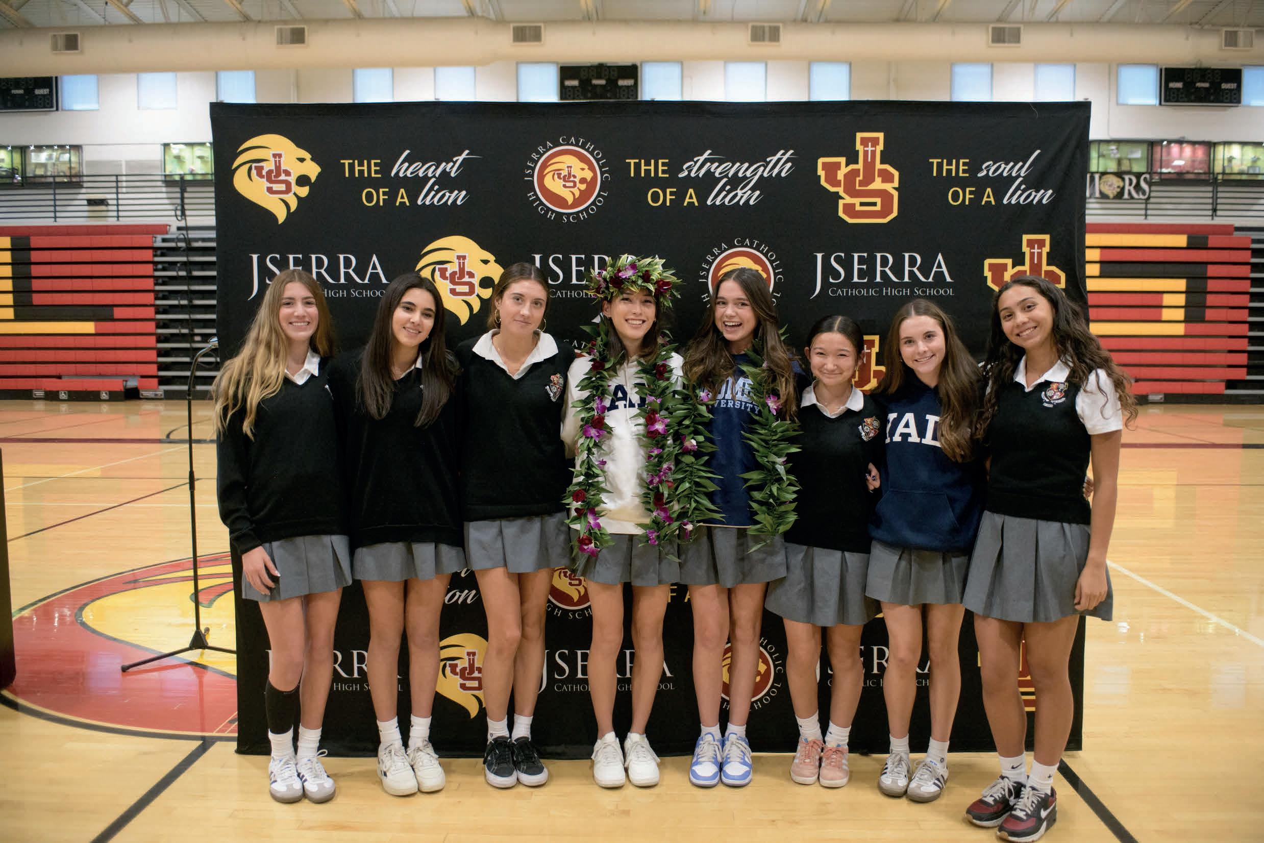 ISABELLA CAPELLO, 11, LEFT, GETS HELP WITH THE BASKET FROM HER MOM SHELBY CAPELLO AS SHAYNA MOEDER, 10, LOOKS ON DURING AN ASSEMBLY AT OUR LADY OF FATIMA ACADEMY IN SAN CLEMENTE.