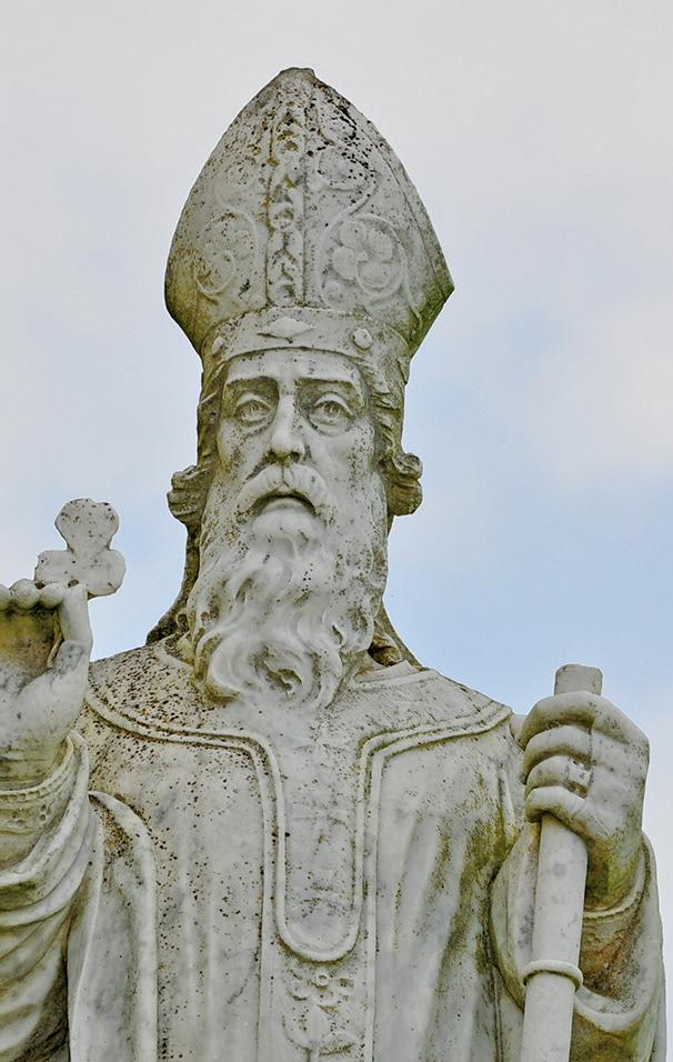 THE PATRON OF IRELAND, this bishop was born in Roman Britain, kidnapped at 16 by Irish raiders and sold into slavery in Ireland. He was a lonely shepherd for six years before escaping and returning home. But his dream of converting the Irish pagans propelled him to priestly studies in Gaul (now France), and about 432 Pope Celestine I consecrated him bishop and sent him to Ireland. For nearly 30 years he preached tirelessly, made countless converts, founded monasteries and established the primatial see at Armagh. Toward the end of his life he made a 40-day retreat in Mayo that gave rise to the famous ongoing Croagh Patrick pilgrimages. Stories of him using the shamrock to explain the Trinity and driving snakes from the island are legend.