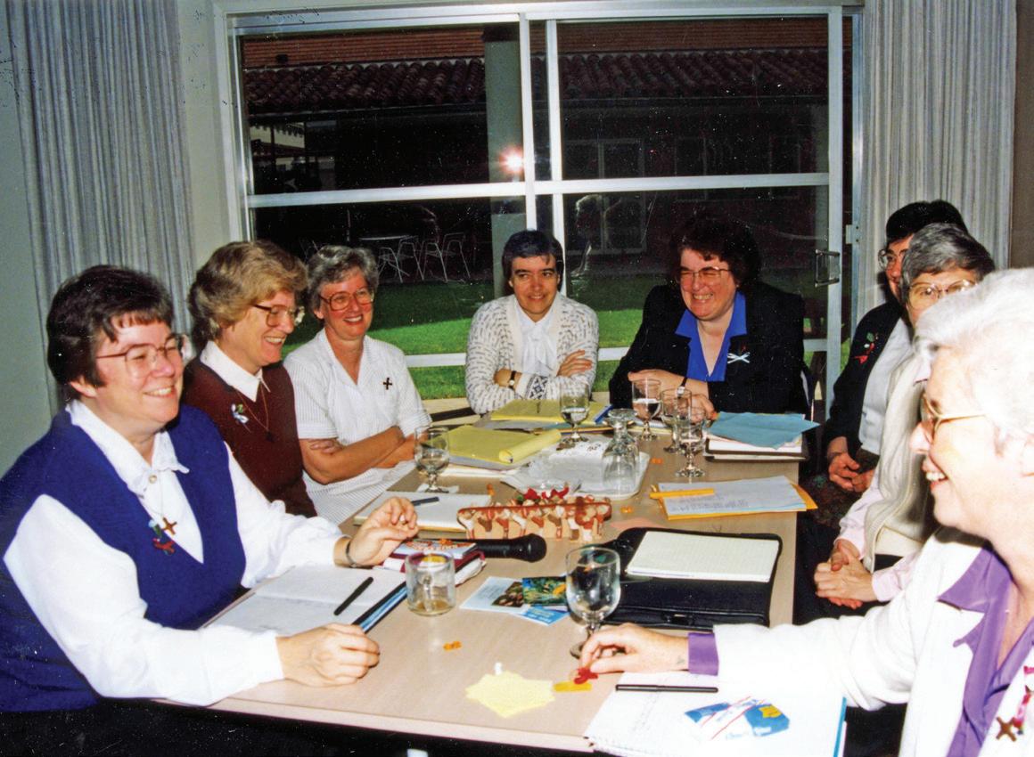 FROM LEFT: SRS. KATHERINE GRAY, MARIANNA GEMMET, JUDITH FERGUS, MARY BERNADETTE MCNULTY, PATRICIA HALEY, JUDITH DUGAN (OBSCURED), BERNICE JORDAN (OBSCURED), NANCY O’CONNOR. THE SISTERS ARE MEETING TO DISCUSS THE SPONSORSHIP COMMITTEE FOR ST. JOSEPH HEALTH SYSTEM IN 1991. COURTESY OF THE SISTERS OF ST. JOSEPH