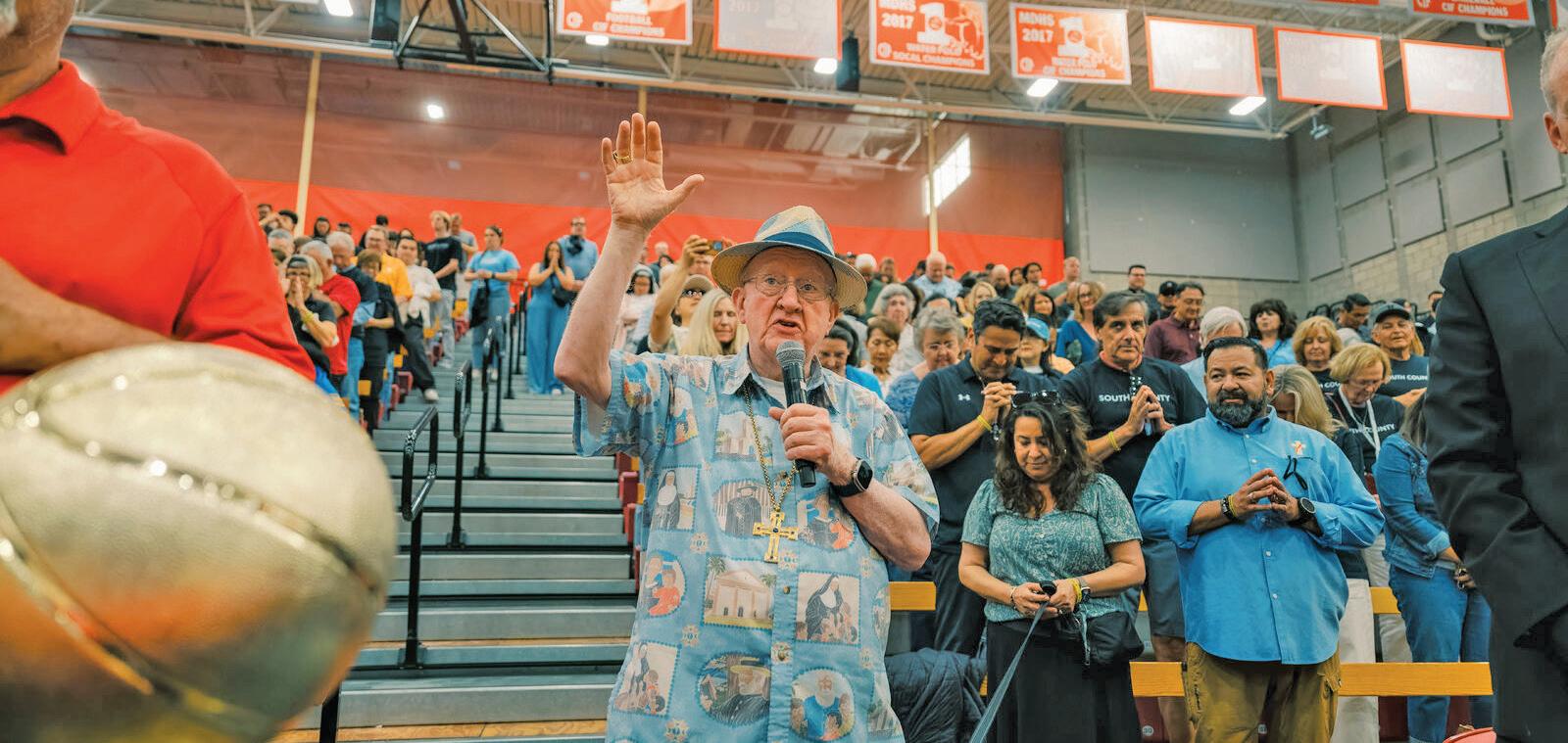 Close to 3,000 spectators filled both sides of the charged-up gymnasium at Mater Dei High School on June 14 – the largest crowd ever in the nine-year history of the contest – to witness a down-to-thewire battle won by priests and seminarians from North Orange County by a score of 52-50 over priests and seminarians from South Orange County.
