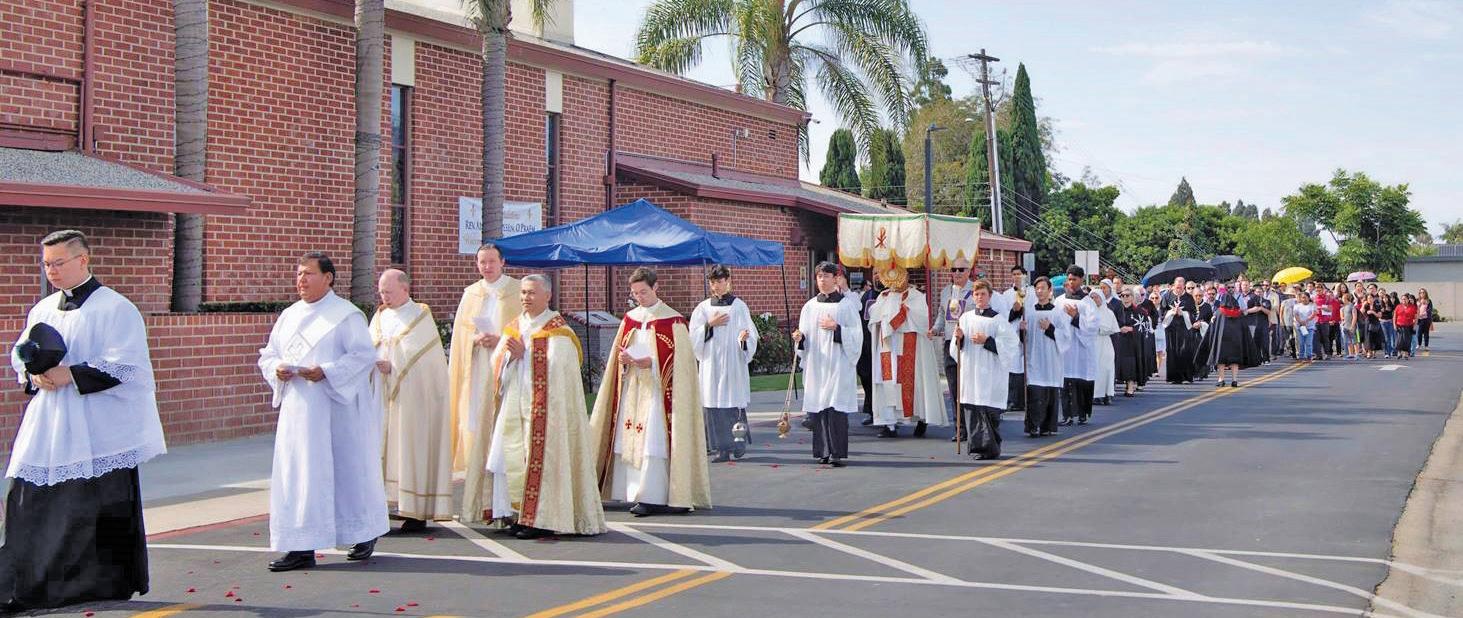 ment while scattering rose petals. Throughout the procession - which included pastor Pascal Nguyen, O.Praem., four parochial vicars, a deacon and seminarian, Norbertine sisters, Knights and Dames of Malta, the Brotherhood of St. Dismas, 19 altar servers, and hundreds of parishioners – the parish music ministries led the faithful in eucharistic hymns in various languages.C