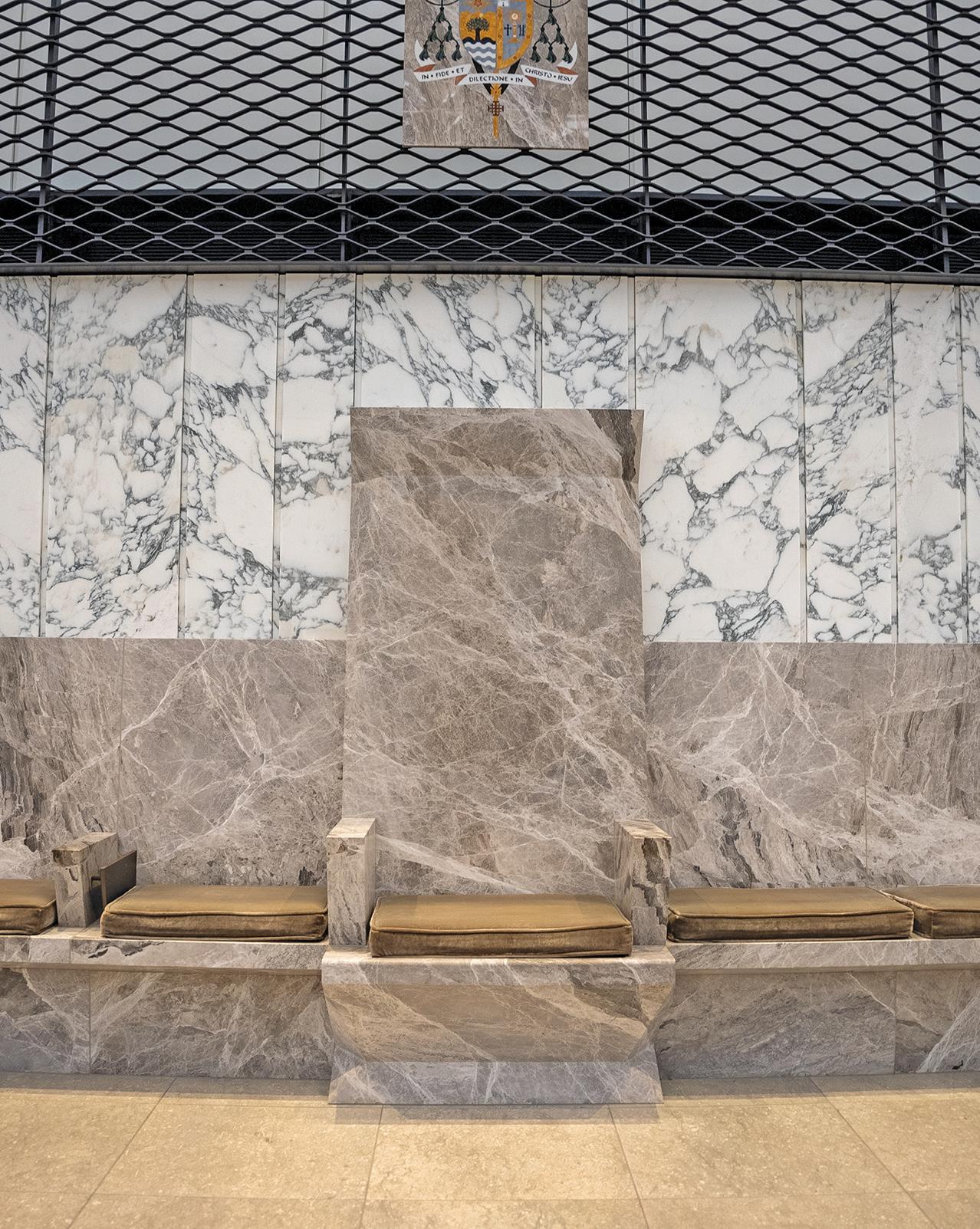 THE CATHEDRA IS THE bishop’s chair. It forms the central element of the bema, a bench-like structure on the north wall within the altar area. Only the current diocesan bishop can sit in the cathedra which is where the word “cathedra” (the bishop’s chair) comes from. The bema also accommodates other bishops, priests and deacons. Photo by Joshua Sudock/Diocese of Orange
