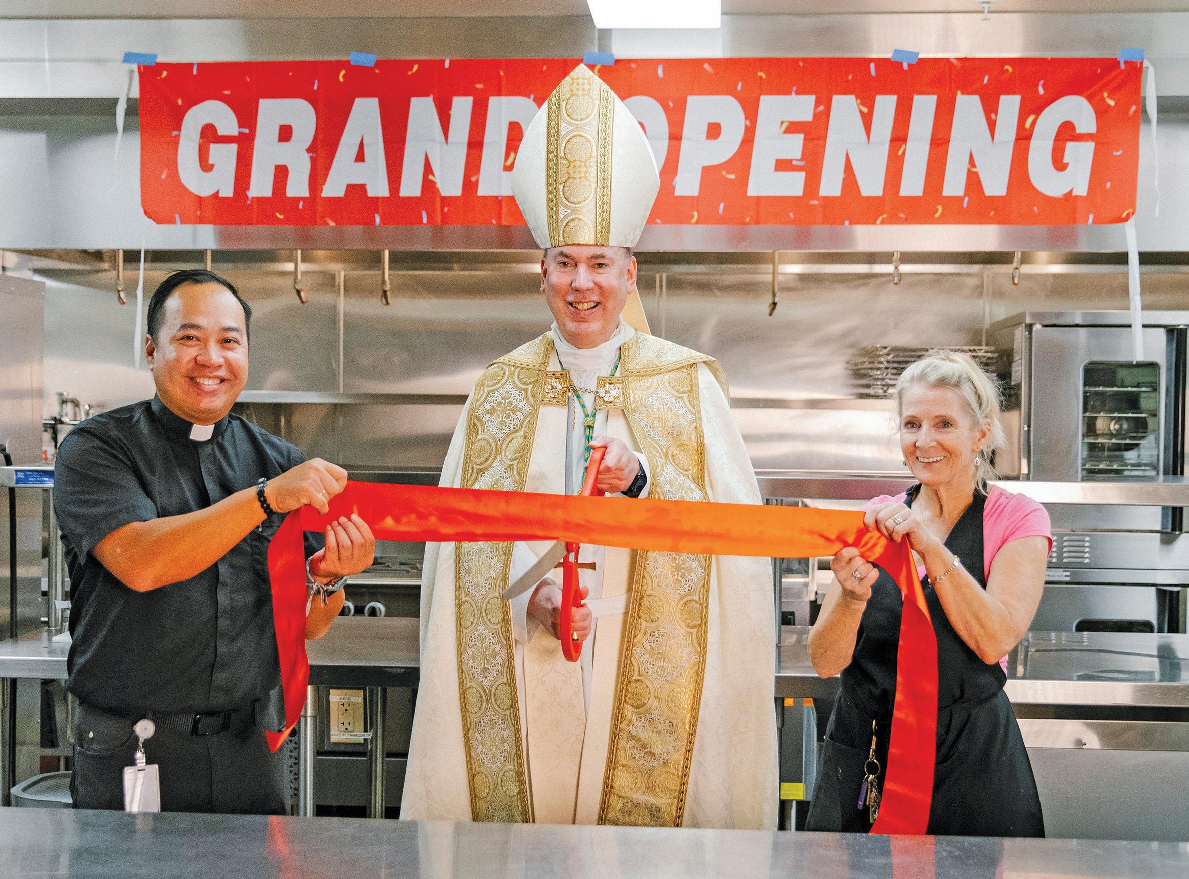 SAN FRANCISCO SOLANO CATHOLIC CHURCH’S STAFF GATHERED ON SEPT. 4 WITH BISHOP TIMOTHY FREYER FOR A SPECIAL BLESSING AND RIBBON CUTTING FOR THEIR RENOVATED KITCHEN. PHOTOS BY EVERETT JOHNSON/ DIOCESE OF ORANGE