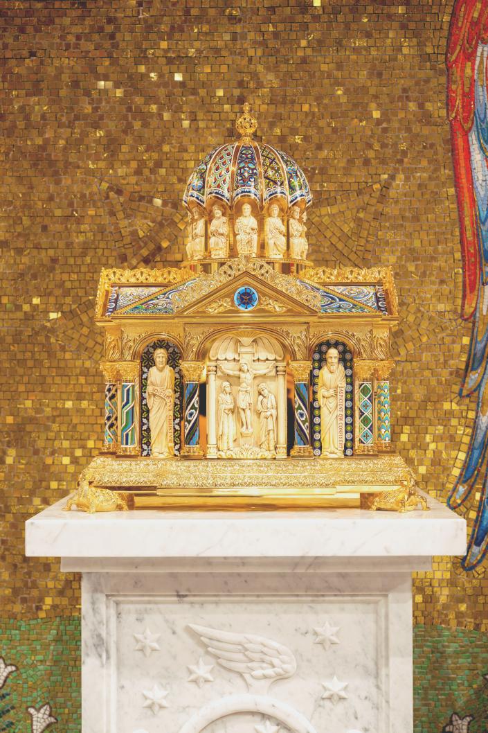 The design of the tabernacle is inspired by 12-century masterpieces of medieval goldsmithing. It is similar to one built circa 1180 in Cologne, Germany, that’s currently on display at the Victoria and Albert Museum in London. It also has design inspiration from items in the German cathedrals of Aachen and Brunswick.
