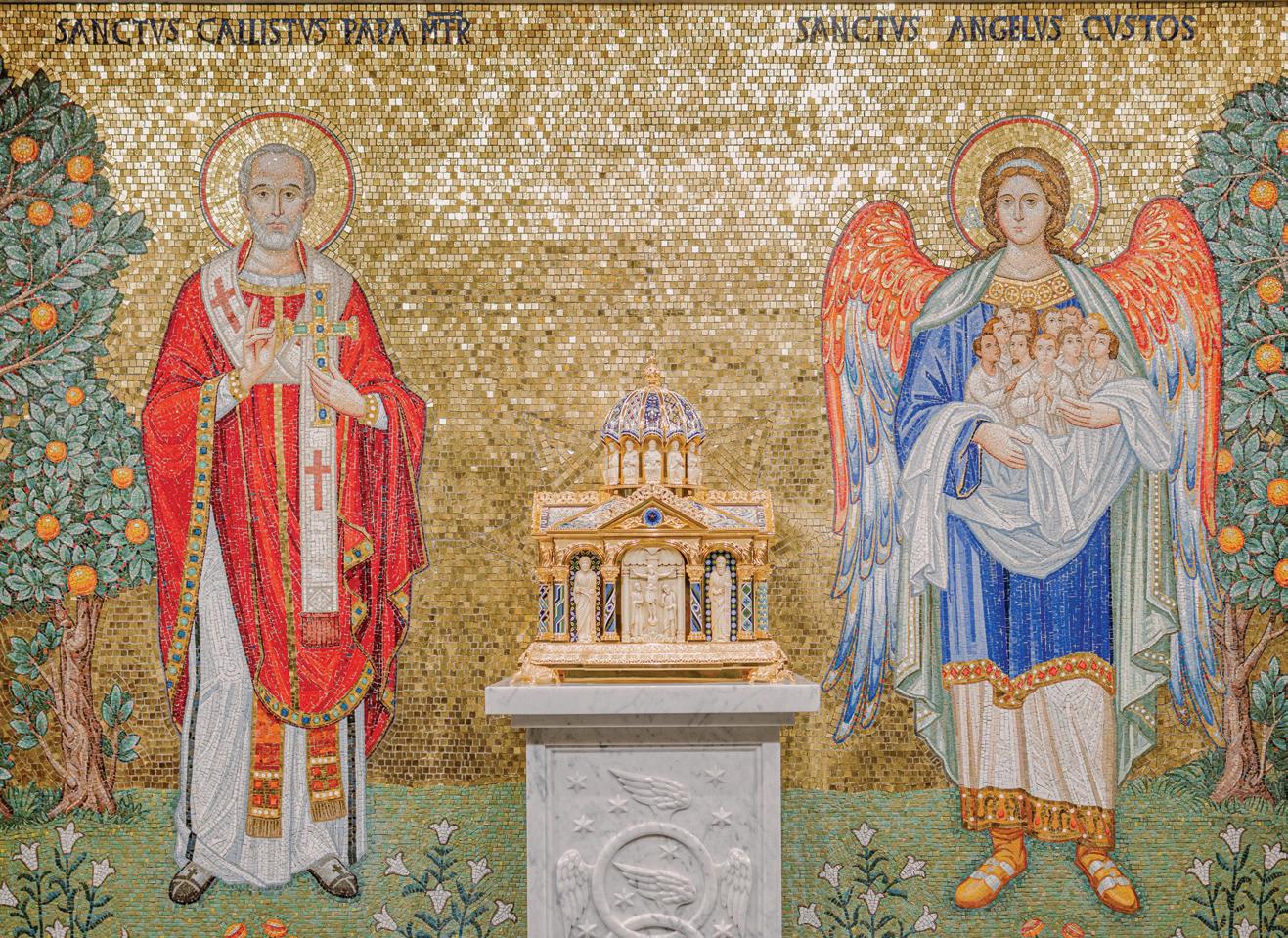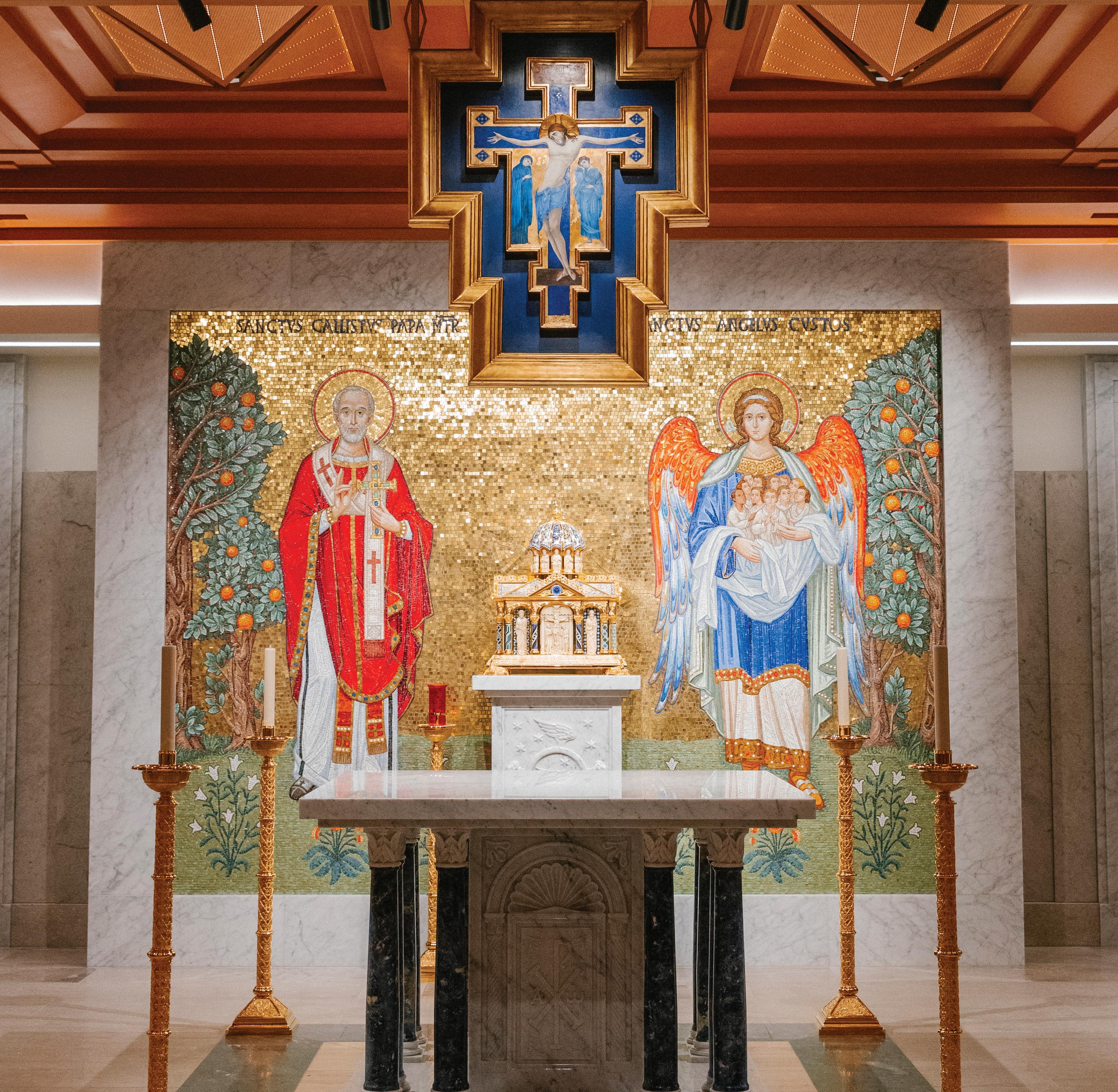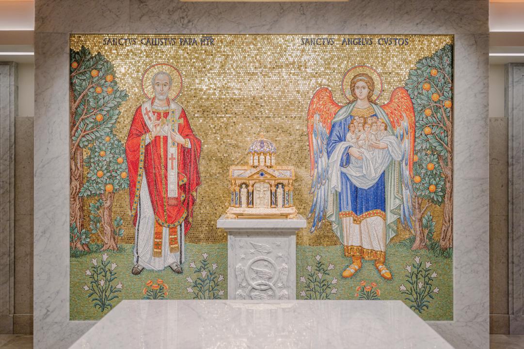 Another notable design element in the new chapel is a large altar mosaic that depicts, on one side, Pope St. Callistus I and, on the other side, a guardian angel holding people who are symbolic of the St. Callistus parishioners.
