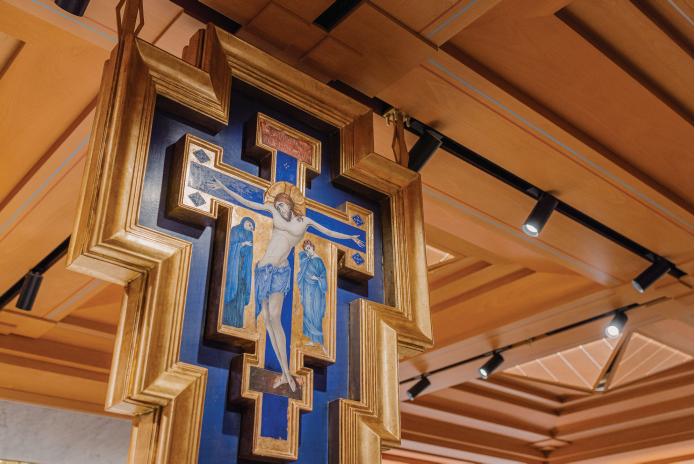 crucifix was handmade in Assisi, Italy, from the personal sacred art collection of ur Holquin, who gifted it to the chapel. hand-painted on wood in the style of the al artist Giovanni Cimabue (c. 1240 to 1302). Its brilliant lapis lazuli color that frames the crucified Lord mirrors the blue pillars supporting the altar. On the back is John 3:16 in Latin: “Sic enim dilexit Deus mundum” (For God so loved the world)