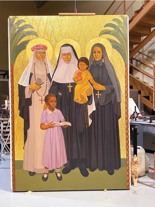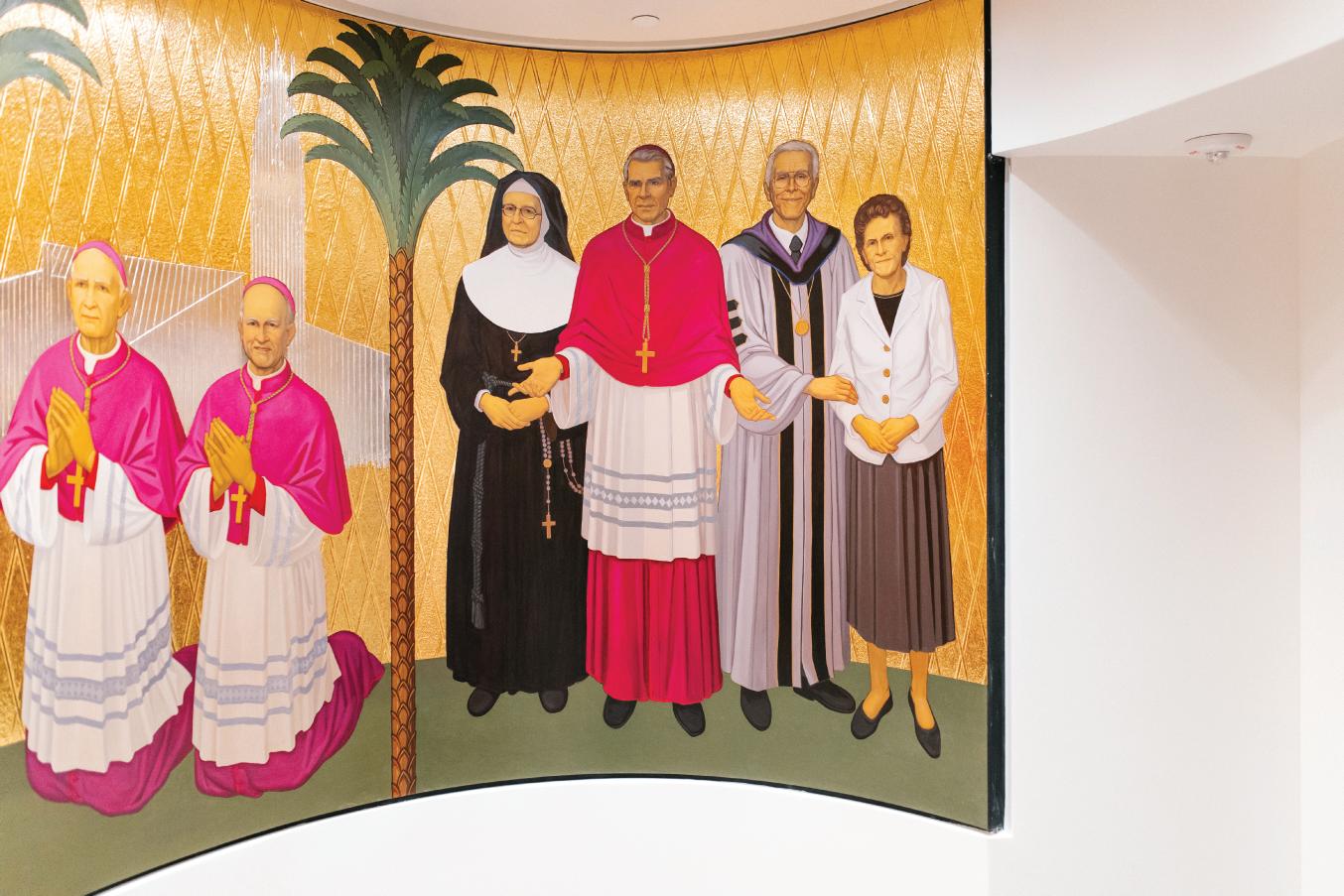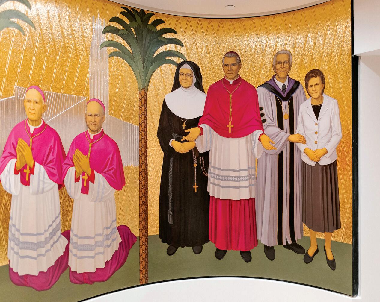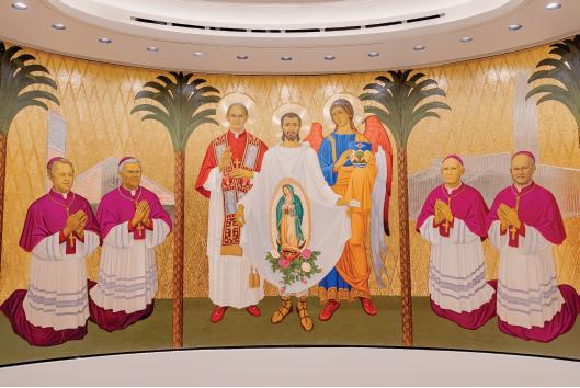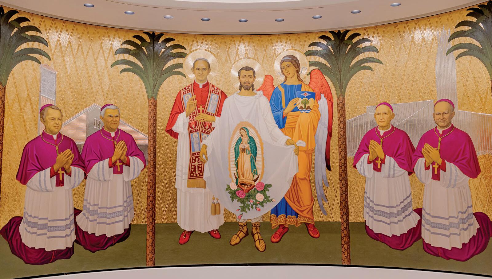 THE OVAL-SHAPED LEGACY CHAPEL, A DEVOTIONAL SIDE CHAPEL OF THE NEW ST. CALLISTUS CHAPEL AND CRYPTS, CONTAINS HAND-PAINTED ART DEPICTING, FROM LEFT, BISHOP WILLIAM JOHNSON AND BISHOP NORMAN MCFARLAND (IN FRONT OF HOLY FAMILY CATHEDRAL, THE DIOCESE’S CATHEDRAL FROM 1976 TO 2019); POPE ST. PAUL VI (THE REIGNING PONTIFF WHEN THE DIOCESE OF ORANGE WAS ESTABLISHED ON JUNE 18, 1976); ST. JUAN DIEGO WITH OUR LADY OF GUADALUPE (THE PATRONESS SAINT OF THE DIOCESE) ON HIS TILMA; A GUARDIAN ANGEL HOLDING THE DIOCESE OF ORANGE CREST; BISHOP TOD BROWN AND BISHOP KEVIN VANN (IN FRONT OF CHRIST CATHEDRAL). NOT PICTURED, BUT ALSO PAINTED IN THE CHAPEL, ARE JUANEÑOS ALONGSIDE ST. JUNÍPERO SERRA (FOUNDER OF MISSION SAN JUAN CAPISTRANO) AND MOTHER BERNARD GOSSELIN, FOUNDER OF THE SISTERS OF ST. JOSEPH OF ORANGE. PHOTO BY EVERETT JOHNSON
