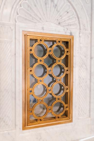 The tabernacle resembles the old basilica over the dome of the Church of Holy Sepulchre in Jerusalem. It is made of gold-plated brass, copper and vitreous (porcelain) enamel, all held together by more than 800 tiny nuts and screws.