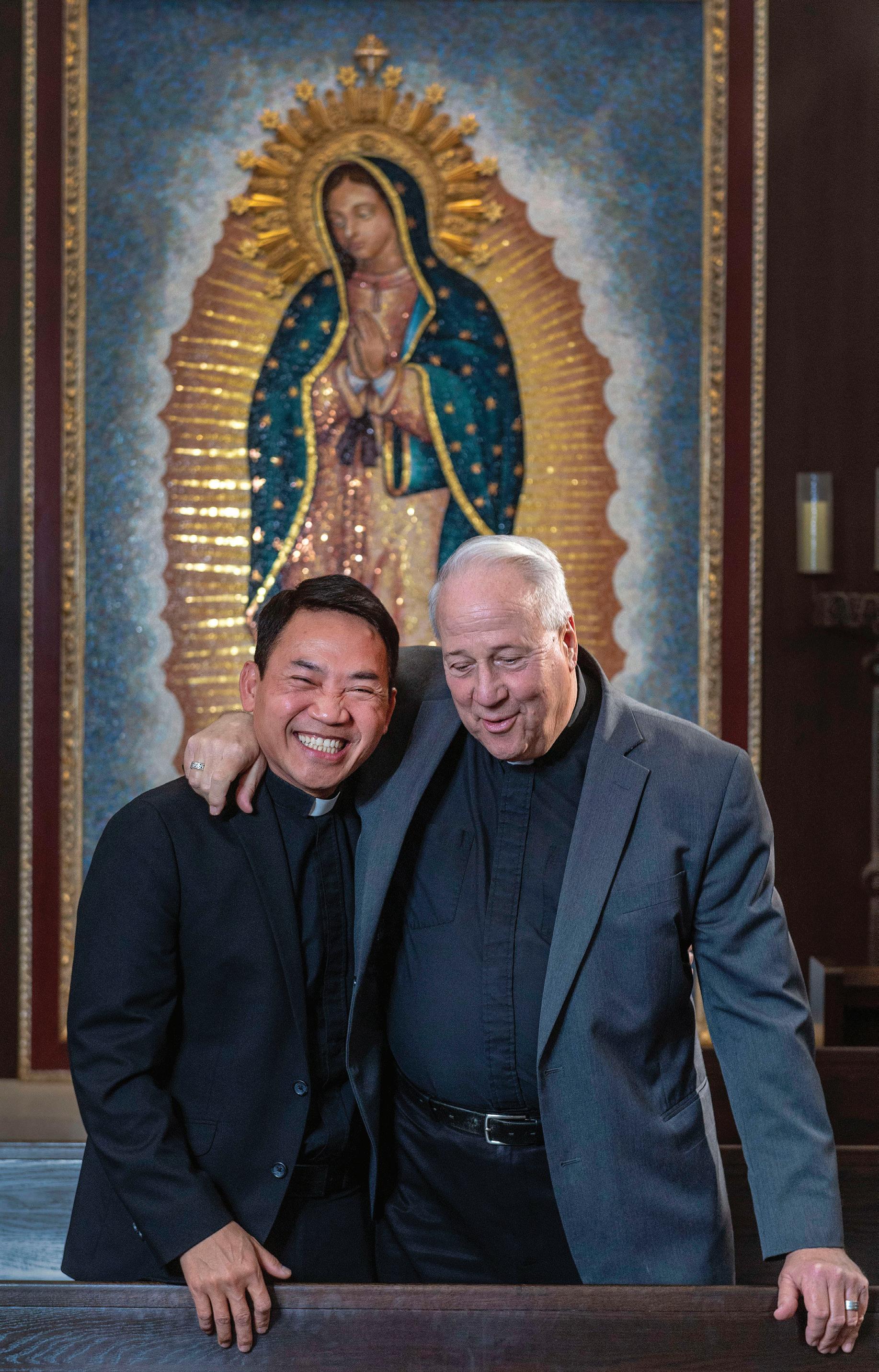 THE OUTGOING RECTOR OF CHRIST CATHEDRAL, FR. CHRISTOPHER SMITH, RIGHT, SHARES A HUG AND WELL WISHES TO FR. BAO THAI AFTER FR. BAO WAS ANNOUNCED TO BE THE NEW RECTOR OF THE CATHEDRAL IN 2022. PHOTO BY MARK RIGHTMIRE
