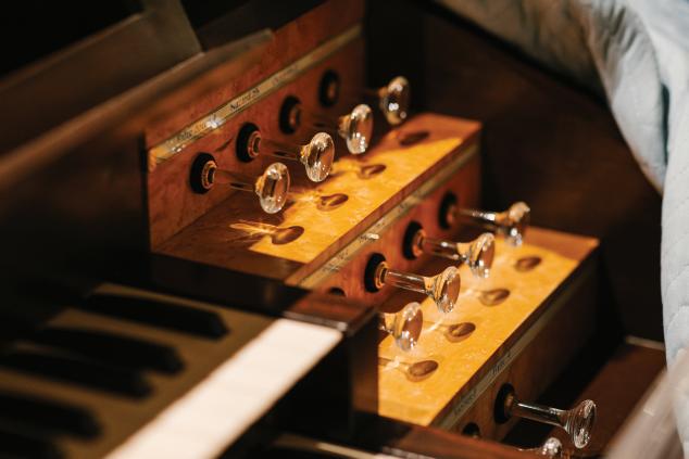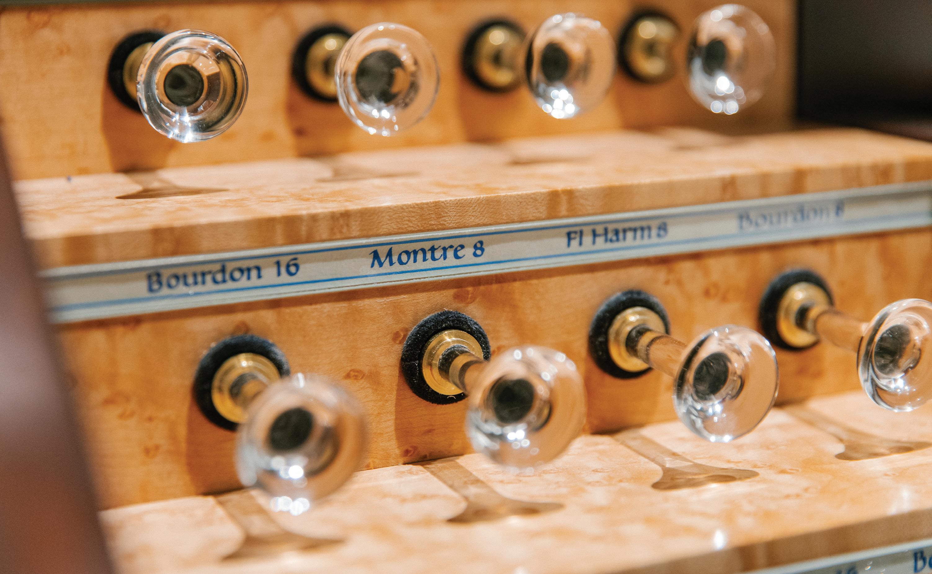 The two-manual console for St. Callistus’ pipe organ has crystal draw knobs — a nod to the building’s former identity as Crystal Cathedral. Above the knobs are the names of the stops in ornate lettering, which was hand-drawn by a San Francisco calligrapher.