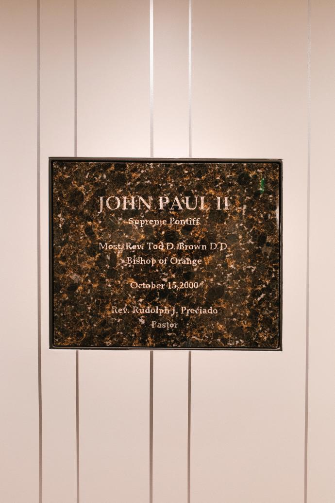 The chapel’s vestibule contains the cornerstone dedication plaque from October 2000 that was originally at St. Callistus parish in Garden Grove.