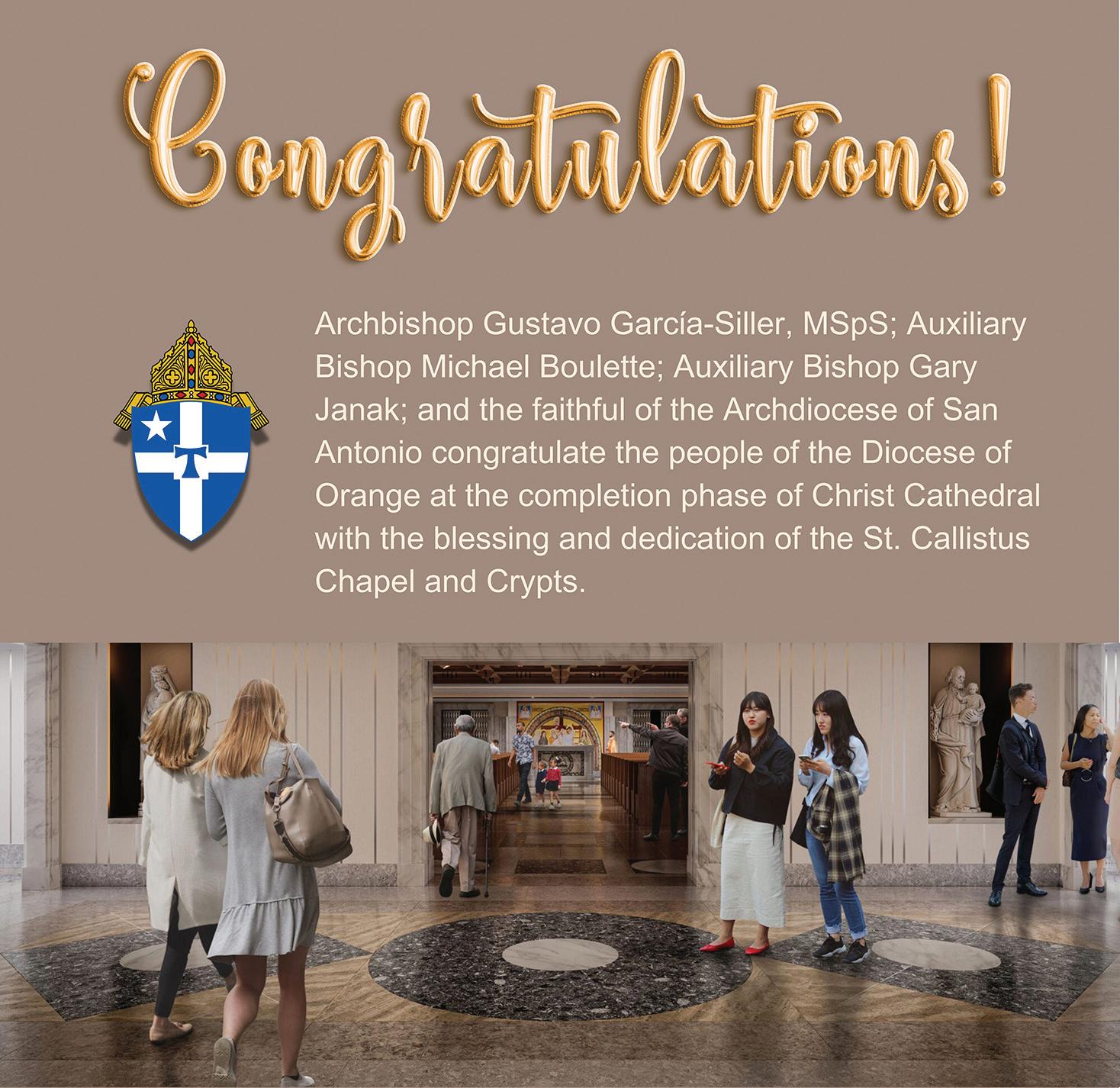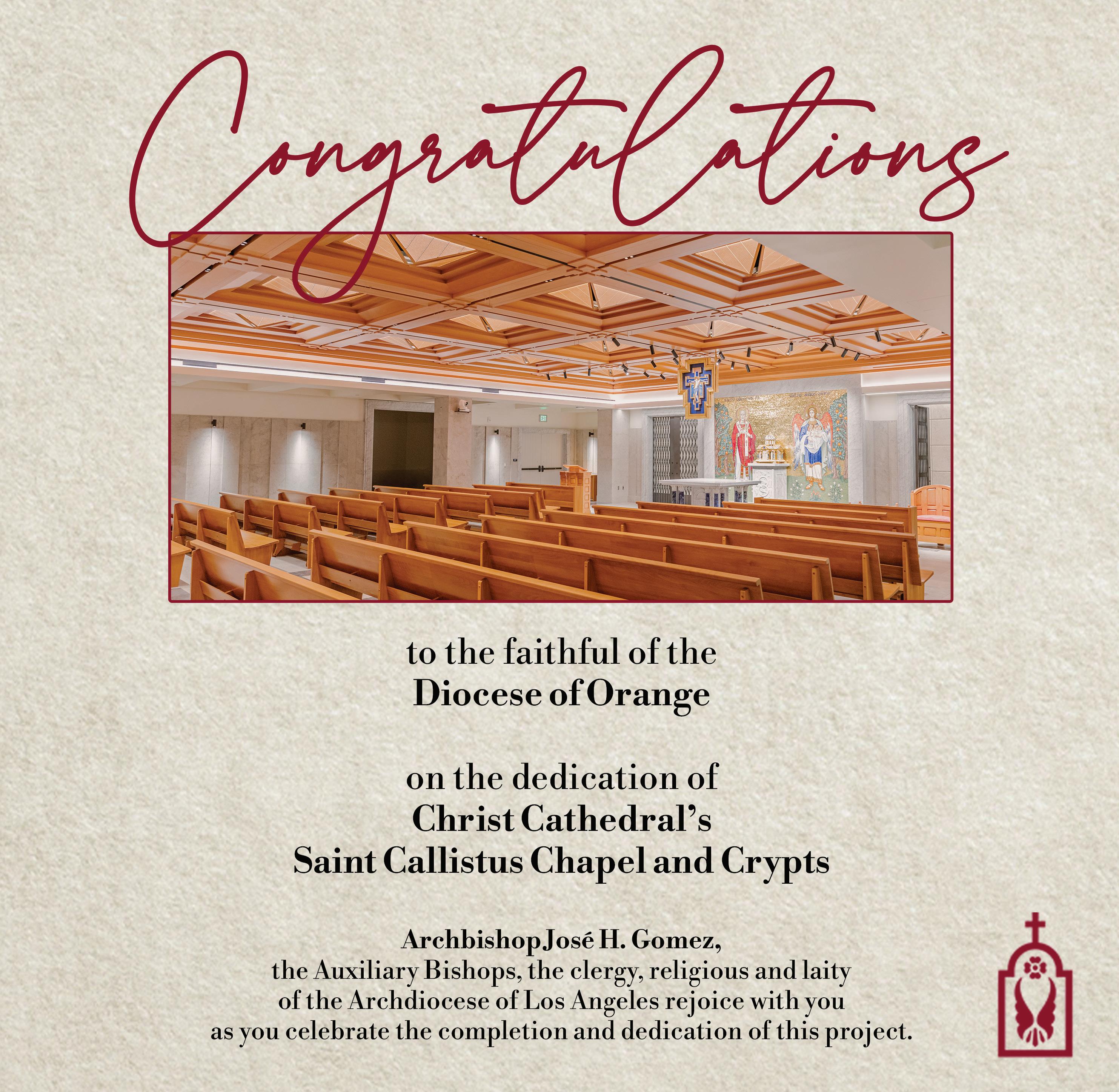 Our warmest greetings and congratulations to the faith community in the Diocese of Orange upon the blessing and dedication of the St. Callistus Chapel and Crypts.