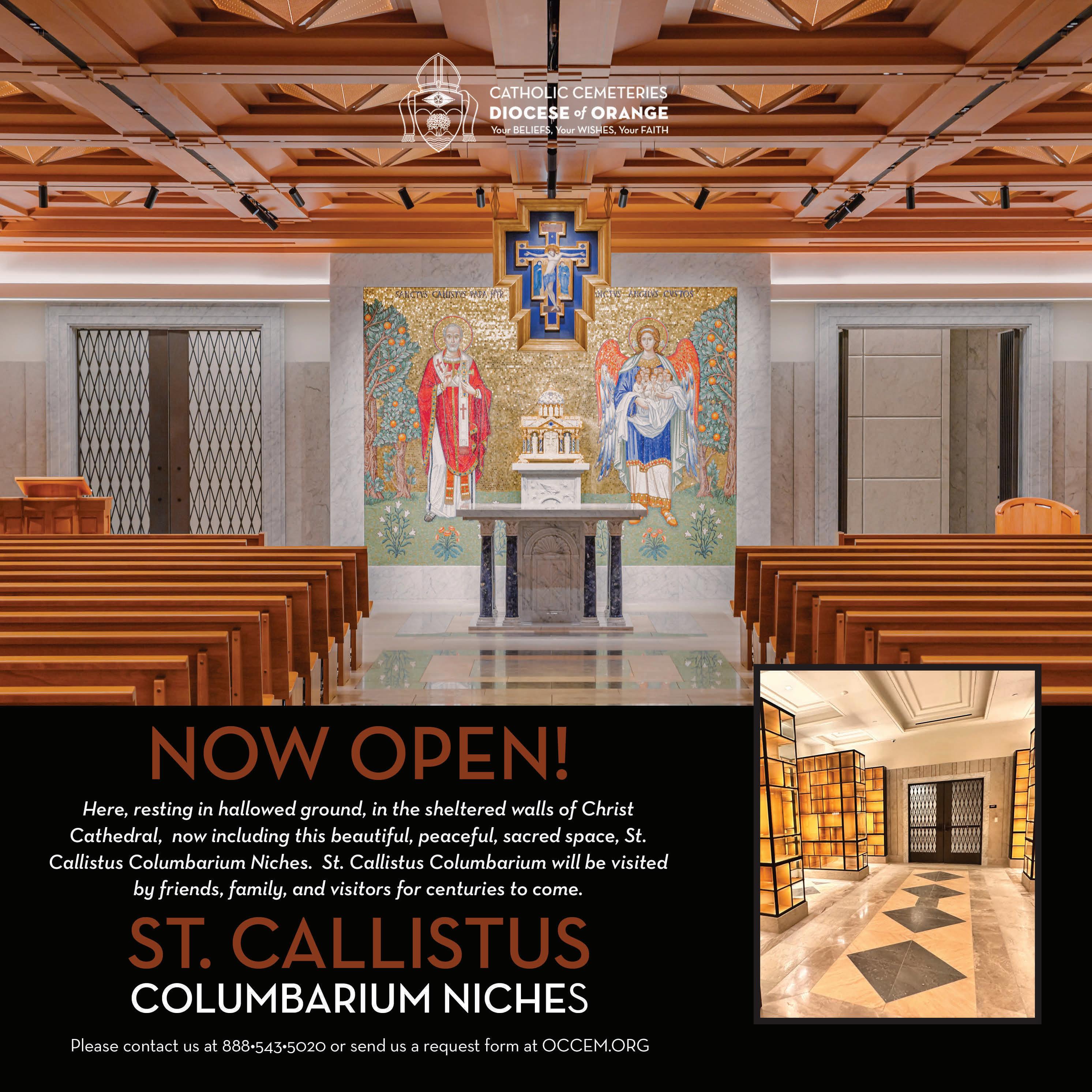 In the third century, Pope St. Callistus I wrote, “In the Lord’s hand, there is an abundance of all things…” How magnificent these 18 centuries later, that a chapel bearing his name is part of the abundance which is Christ Cathedral in the Diocese of Orange! By the grace of God and the steadfast faith of God’s people, Christ Cathedral, now including the St. Callistus Chapel and Crypts will continue to be a place for Christ forever. C