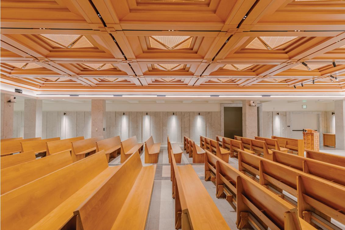 The pews were made by the Marshall Company, the same Idaho-based firm that built Christ Cathedral’s pews and those for the Crystal Cathedral. The chapel can hold approximately 220 people.