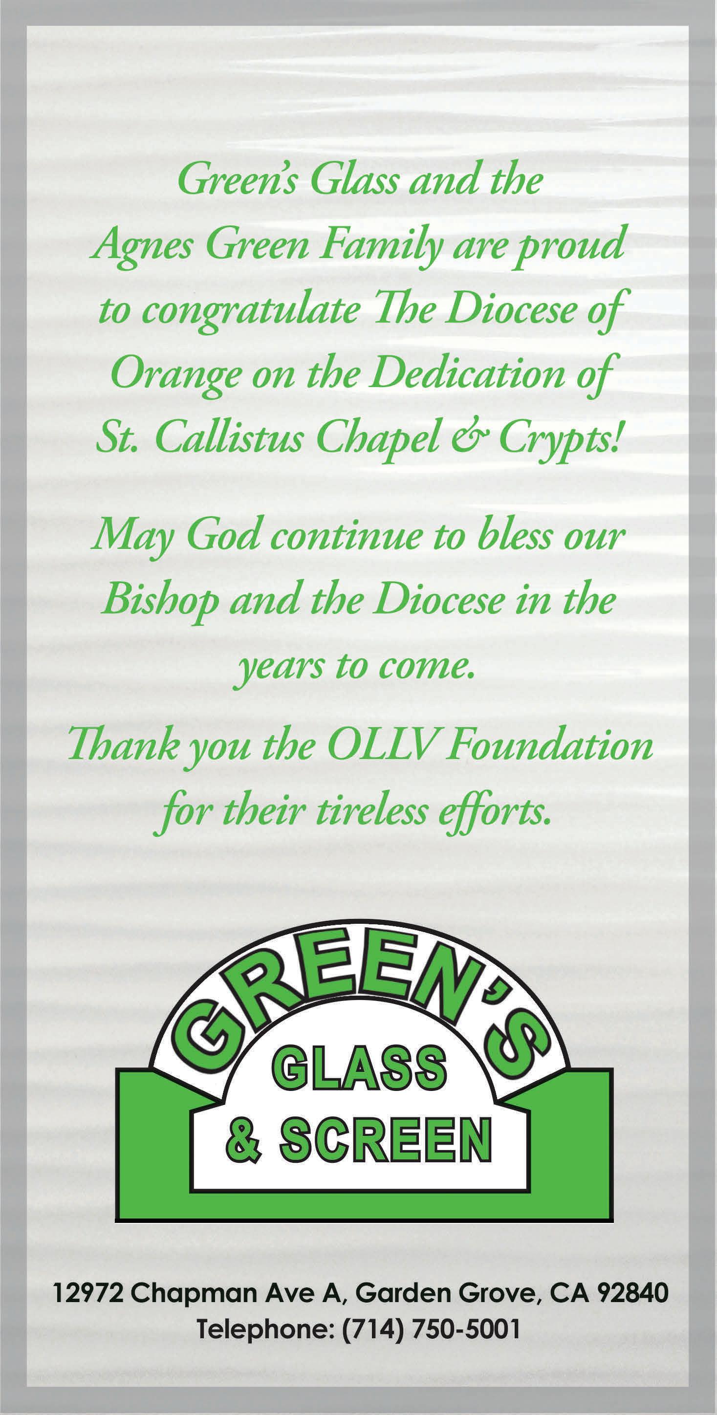 All of us at Hilgenfeld Mortuary send our most sincere congratulations to the Diocese of Orange on the Dedication and Blessing of Christ Cathedral's St Callistus Chapel and Crypts. May it serve as a revered place of worship for Orange County's parishioners for generations to come.