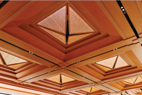 The ceiling contains 24 sets of quatrefoils, a nod to the year 2024 when the chapel is being dedicated. The wooden quatrefoils have embedded LEDs and were made by Taber, a millwork company in Irvine. Their inclusion in the chapel mimics the quatrefoils upstairs in Christ Cathedral. The ceiling also contains red and blue pinstriping — colors representing Jesus’ divinity and humanity.