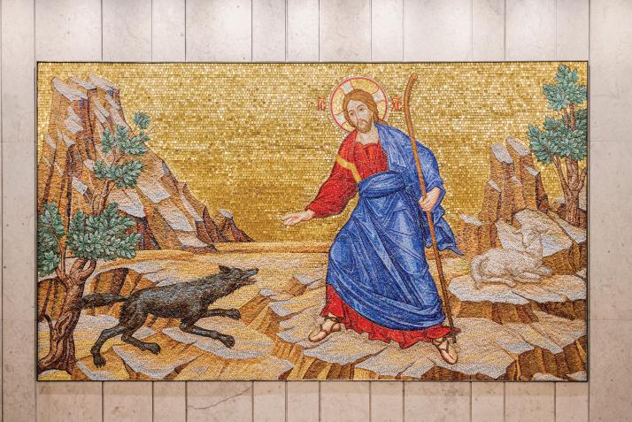 The mosaic in the crypts depicts Jesus as the good shepherd, defending His sheep from a wolf. He wears red and blue, symbolic of His divinity (red) and humanity (blue)