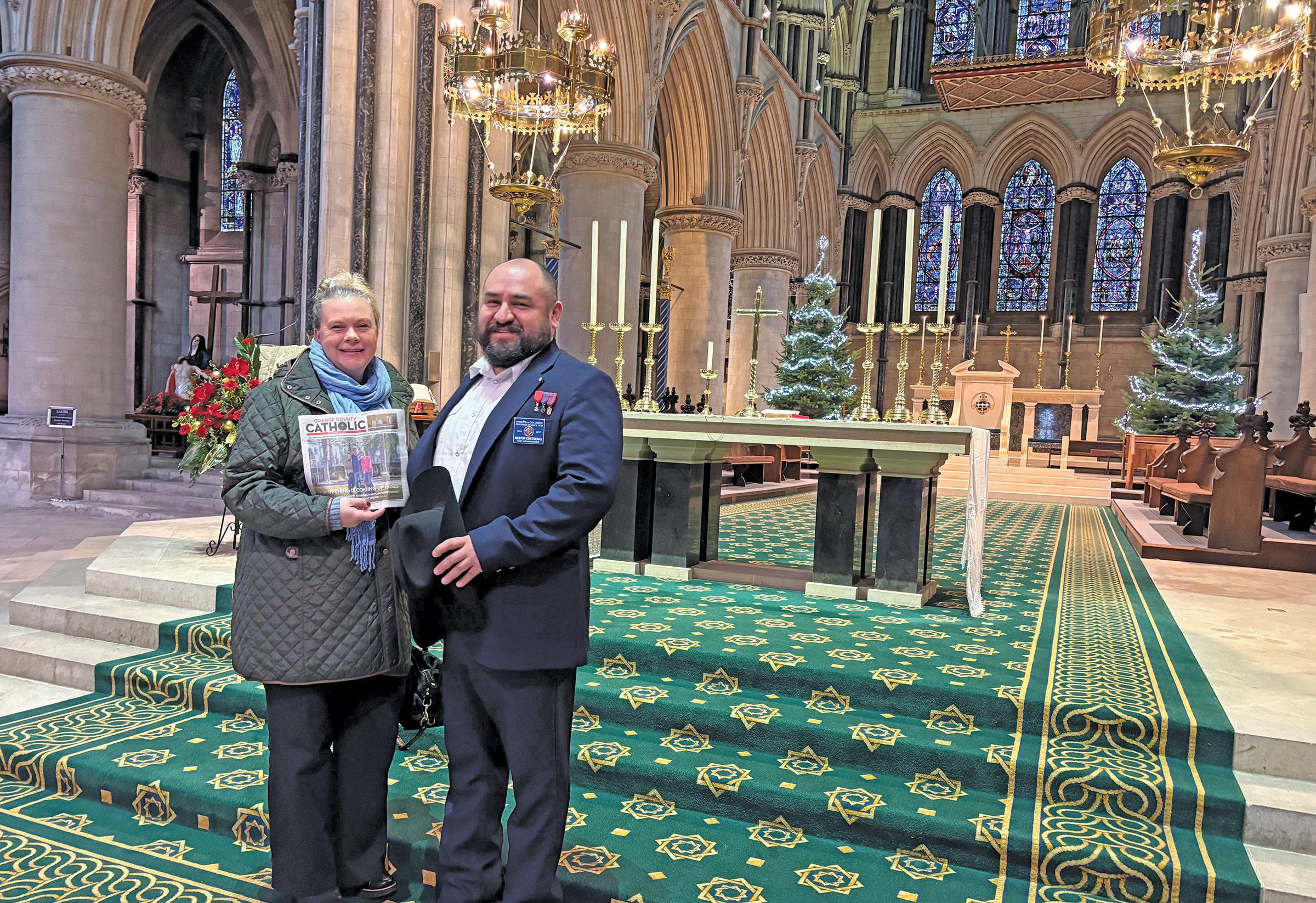 Elise Bowles and Nestor Contreras visited the Cathedral of St. John the Baptist in Norwich, England, and brought along a copy of OC Catholic. The building of this church, an example of Victorian Gothic Revival architecture, began in 1882 and was completed in 1910.