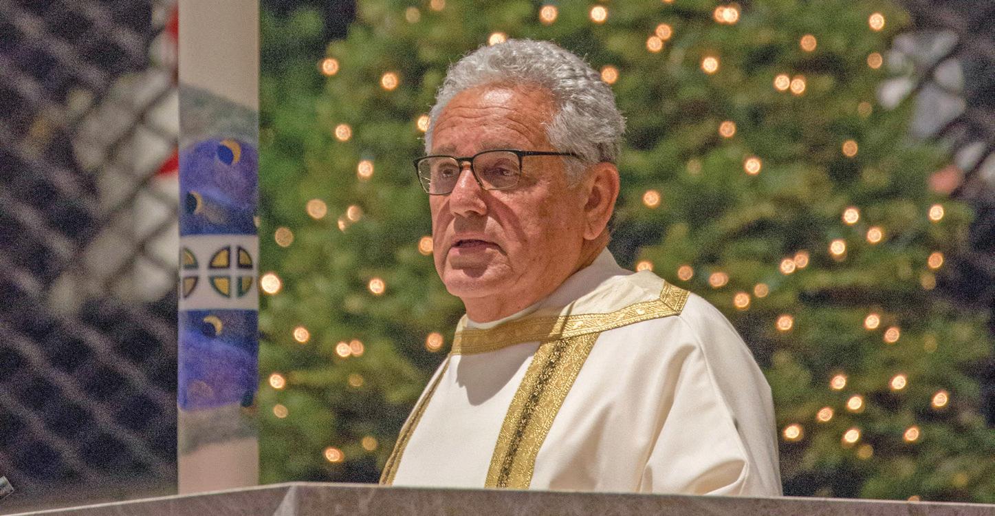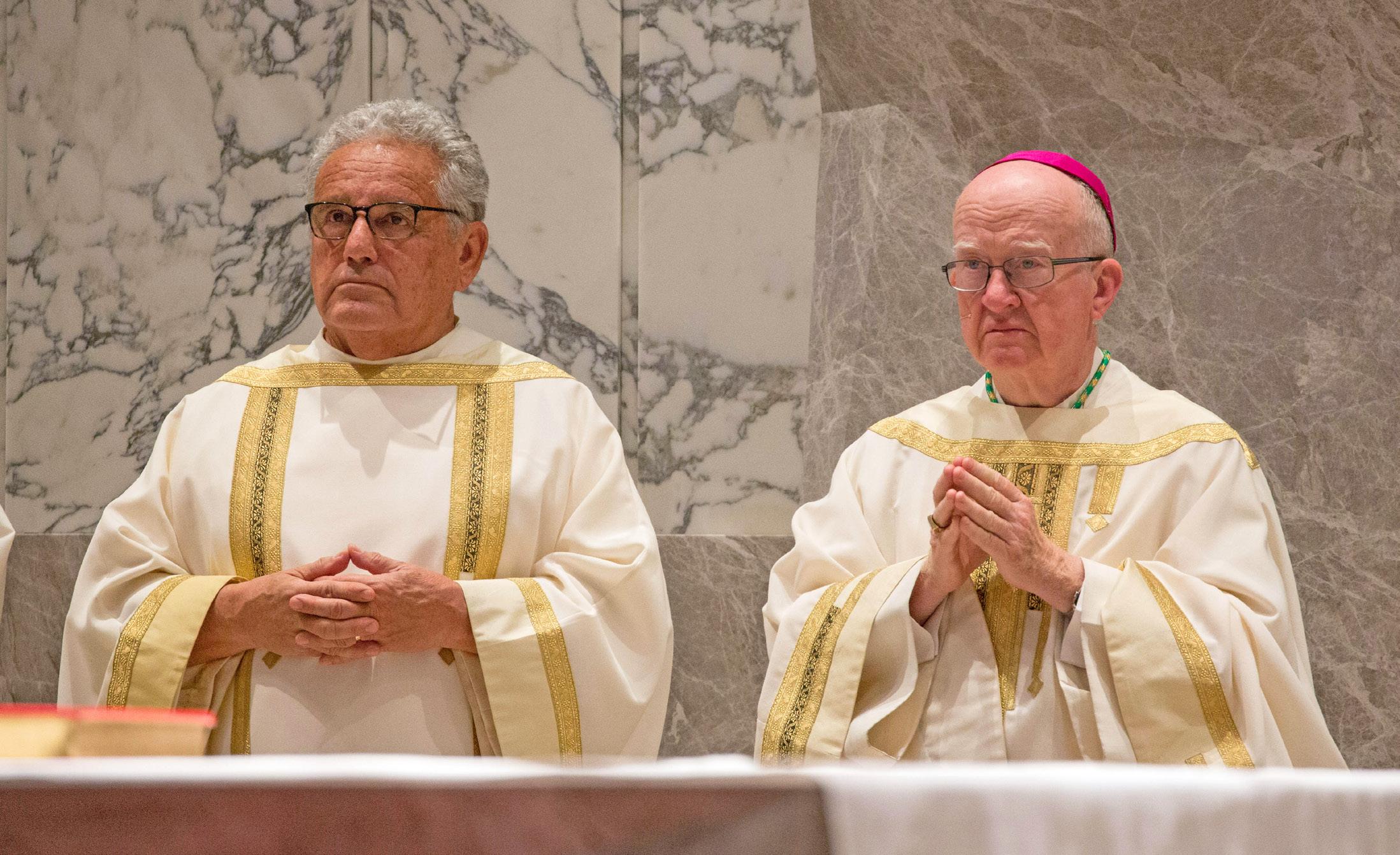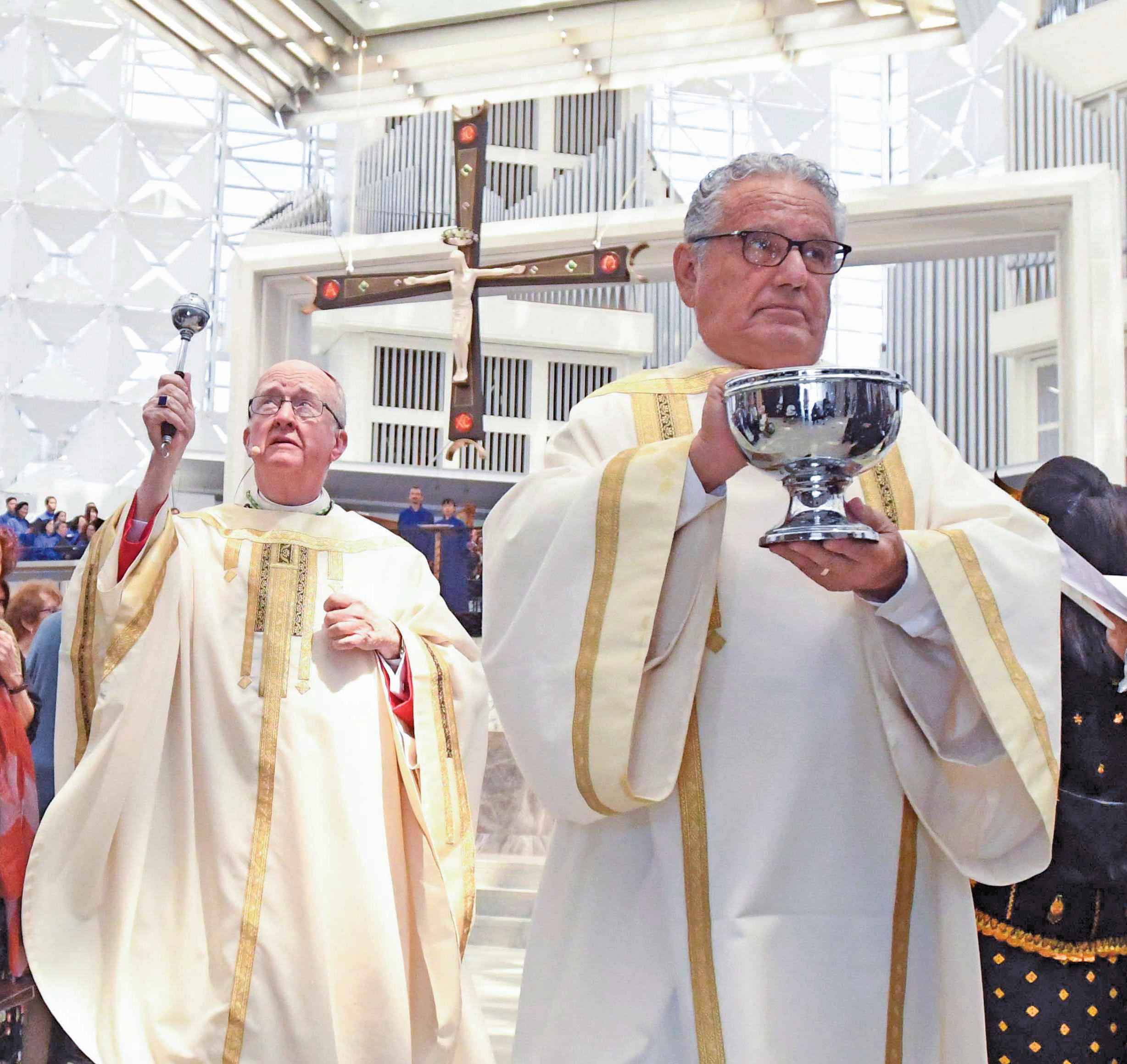 DEACON FRANK CHAVEZ STANDS AT THE ALTAR WITH BISHOP KEVIN VANN DURING THE FIRST MIDNIGHT MASS AT CHRIST CATHEDRAL ON DECEMBER 25, 2019. COURTESY OF THE DIOCESE OF ORANGE