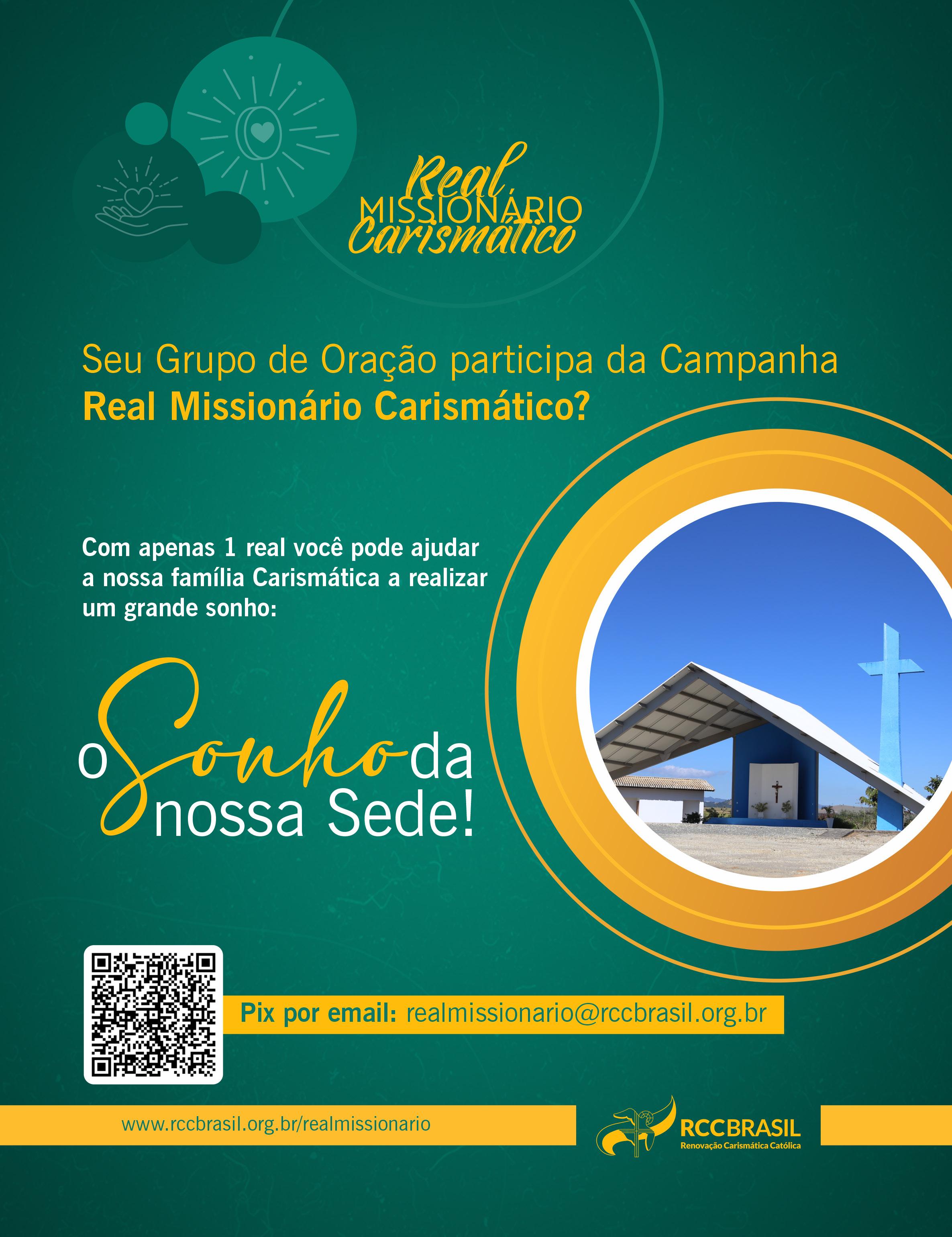 Amado(a) irmão(ã), a sua colaboração para a Renovação Carismática Católica do Brasil possibilita a real ização de muitos trabalhos missionários em todo Brasil. Essa grande ação evangelizadora é desenvolvida semanalmente em quase 15 mil Grupos de Oração. Sua fidelidade fortalece o Grupo de Oração e potencializa o propagar da experiência do Batismo no Espírito Santo a mais pessoas. Continuamos contando com você. Muito obrigado!