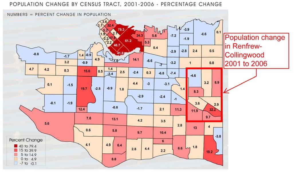 Between 2001 and 2006, the population in RenfrewCollingwood grew by 8.8% to 48,885, compared with a City growth of 5.9%.