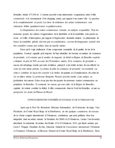 Bruxelles atteint 475.000 m². L’orateur procède à une intéressante comparaison entre l’offre commerciale et le rayonnement d’un shopping center, par rapport à un centre-ville. La question de la complémentarité est posée. Les lieux de réalisation des achats vestimentaires sont clairement définis quantitativement et qualitativement. La fréquentation des centres commerciaux existants est analysée et quantifiée. Pour les nouveaux projets, les critères d’appréciation de la faisabilité et de la rentabilité sont passés en revue ; et l’effet d’interception par rapport à l’hypercentre demande analyse. Le phénomène de baisse de rentabilité globale doit être pris en considération, car tout développement extensif doit être considéré comme peu réaliste dans un marché mature. Parce qu’il s’agit réellement d’une composante essentielle de la qualité de vie de la population, l’orateur rappelle qu’il importe de bien identifier les besoins en matière de commerce de proximité, et il constate que le nombre de magasins de détail en Région de Bruxelles-capitale a diminué de près de 50% au cours des 50 dernières années. Et le commerce de proximité a encore été advantage touché par cette évolution, puisqu’il a été réduit au tiers de son effectif au cours de cette même période. La notion de pôle de commerce de proximité est essentielle car celui-ci contribue de façon très concrète à la vitalité du quartier et à l’amélioration du cadre de vie en milieu urbain. Le professeur Benjamin Wayens procède ensuite à une analyse en profondeur des raisons d’être ou ne pas être des projets de nouveaux centres commerciaux en périphérie de Bruxelles. Il commente les raisons qui sont celles de la Région de Bruxellescapitale, de vouloir combler le déficit d’offre commerciale dans le Nord de Bruxelles, et met en perspective les atouts du Plateau du Heysel. CONCLUSIONS DU CONGRÈS ET ETOILES D’OR D’URBANICOM Après que le Prof. Dr. Bernadette Mérenne-Schoumaker, de l’Université de Liège, VicePrésidente du Comité Royal Belge de la Distribution, aie tiré quelques conclusions des travaux de ce 14ème congrès international d’Urbanicom, conclusions que nous publions dans leur intégralité dans un article suivant; le Président du CRBD et d’Urbanicom, Lucien Van Boxstael, introduisit la cérémonie de remise des Etoiles d’Or d’Urbanicom 2014, qui furent remises par Léon F. Wegnez, Président du Jury, Directeur Général de l’Association international Urbanisme et Commerce Urbanicom, et Directeur Général du Comité Royal Belge de la Distribution. Deux Holistic Market ing Management