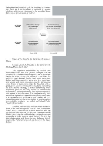 Figure 1: The Jobs-To-Be-Done Growth Strategy Matrix Source: Ulwick, T., The Jobs-to-be-Done Growth Strategy Matrix, Jan 5, 2017 This approach (introduced by Ulwick and illustrating when and how growth strategies can be adopted by companies in the quest to win in a market) began by categorizing the different possibilities for products and services (better and more expensive, better and less expensive, worse and less expensive, and worse and more expensive), and by considering what types of customers might be targeted with a product or service offering (five situations warranting its own distinct strategy: a better-performing, more expensive product will only appeal to underserved customers; a better-performing, less expensive product will appeal to all customers; a worse-performing, less expensive product will appeal to overserved customers; a worse-performing, more expensive product will only appeal to customers for whom limited or no alternatives are available; products so- called by Michael Porter “stuck in the middle). And this reference to Michael Porter made us think to his well-recognized “Value Chain Framework” (1985), and to correlate this article’s approach with the recently Michael Hinshaw’s “Customer Experience Value Chain” (describing the eight activities companies should undertake in order to drive value through CX, and the interrelationships and dependencies between them)5 inspired by Porter’s framework, as shown in the figure below: