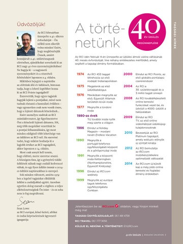 Az RCI februárban ünnepelte a 40. sikeres évfordulóját – Ön nélkül nem sikerült volna mindez! Ezért, hogy megköszönjük Önnek, amiért hozzájárult a 40. születésnapunk eléréséhez, ajándékokat sorsolunk ki az RCI nagy 40 éves nyereményjátékában! Ne hagyja ki – a nagyszerű nyereményekért és a részvételi feltételekért lapozzon a 4. oldalra. Miközben bejegyzi a naptárába az előttünk álló év üdüléseit, biztosan tudja, hogy a lehető legtöbbet hozza ki az RCI Points tagságából? Észrevettük, hogy egyes tagjaink hagyják lejárni a pontjaikat, mivel nem tudnak elutazni a használati évükben – vagy egyszerűen csak nem veszik észre, hogy a lejárati dátumok közelednek... Ezért személyre szabtuk az RCI számlakivonatot, így figyelmeztetve Önt a közeledő lejárati dátumra. Sőt, még több megoldást vezettünk be a pontjai felhasználására, így most minden eddiginél több lehetősége van az üdülésre az RCI-nél. Ha szeretné tudni, hogy miként hozhatja ki a legjobb értéket az RCI tagságából, akkor lapozzon a 14. oldalra. Most csak annyit kell tennie, hogy eldönti, merre szeretne utazni. A feleségem finn, így a gyönyörű vidéki üdülések nálunk nagy családi kedvenccé váltak, és egy ilyen üdülés immár a 2014es üdülési naptárunkban is szerepel. Sok minden változott, amióta 1974ben a legelső tagjainkat elküldtük üdülni a családjukkal együtt. Azonban egyetlen dolog maradt a régiben: a teljes elkötelezettségünk Ön iránt – és ez soha nem is fog megváltozni.