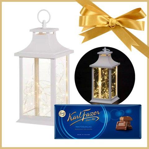 Tunnelmalliseen iltaan Fazerin Sininen suklaalevy sekä valkoinen muovilyhty, jonka sisällä valoa tuo led-valolanka.