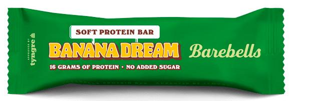 Barebells Soft Bar Banana Dream -proteiinipatukassa on pehmeä banaaninmakuinen ydin, päällä karamellikastiketta ja maitosuklaata. Tämä proteiinipatukka sisältää 16 grammaa proteiinia, eikä yhtään lisättyä sokeria.