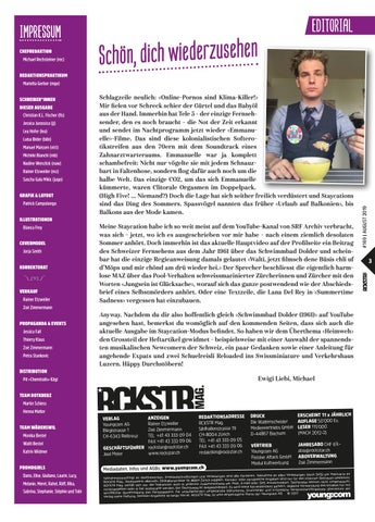 Schlagzeile neulich: «Online-Pornos sind Klima-Killer!» Mir fielen vor Schreck schier der Gürtel und das Babyöl aus der Hand. Immerhin hat Tele 5 – der einzige Fernsehsender, den es noch braucht – die Not der Zeit erkannt und sendet im Nachtprogramm jetzt wieder «Emmanuelle»-Filme. Das sind diese kolonialistischen Softerotikstreifen aus den 70ern mit dem Soundtrack eines Zahnarztwarteraums. Emmanuelle war ja komplett schambefreit: Nicht nur vögelte sie mit jedem Schnauzbart in Faltenhose, sondern flog dafür auch noch um die halbe Welt. Das einzige CO2, um das sich Emmanuelle kümmerte, waren Clitorale Orgasmen im Doppelpack. (High Five! ... Niemand?) Doch die Lage hat sich seither freilich verdüstert und Staycations sind das Ding des Sommers. Spassvögel nannten das früher «Urlaub auf Balkonien», bis Balkons aus der Mode kamen. Meine Staycation habe ich so weit meist auf dem YouTube-Kanal von SRF Archiv verbracht, was sich – jetzt, wo ich es ausgeschrieben vor mir habe – nach einem ziemlich desolaten Sommer anhört. Doch immerhin ist das aktuelle Hauptvideo auf der Profilseite ein Beitrag des Schweizer Fernsehens aus dem Jahr 1961 über das Schwimmbad Dolder und scheinbar hat die einzige Regieanweisung damals gelautet «Walti, jetzt filmsch dene Büsis chli uf d’Möps und mir chönd am drü wieder hei.» Der Sprecher beschliesst die eigentlich harmlose MAZ über das Pool-Verhalten schweissmarinierter Zürcherinnen und Zürcher mit den Worten «Jungsein ist Glücksache», worauf sich das ganze postwendend wie der Abschiedsbrief eines Selbstmörders anhört. Oder eine Textzeile, die Lana Del Rey in «Summertime Sadness» vergessen hat einzubauen. Anyway. Nachdem du dir also hoffentlich gleich «Schwimmbad Dolder (1961)» auf YouTube angesehen hast, bemerkst du womöglich auf den kommenden Seiten, dass sich auch die aktuelle Ausgabe im Staycation-Modus befindet. So haben wir dem Überthema «Heimweh» den Grossteil der Heftartikel gewidmet – beispielsweise mit einer Auswahl der spannendsten musikalischen Newcomern der Schweiz, ein paar Gedanken sowie einer Anleitung für angehende Expats und zwei Schuelreisli Reloaded ins Swissminiature und Verkehrshaus Luzern. Häppy Durchstöbern! Ewigi Liebi, Michael