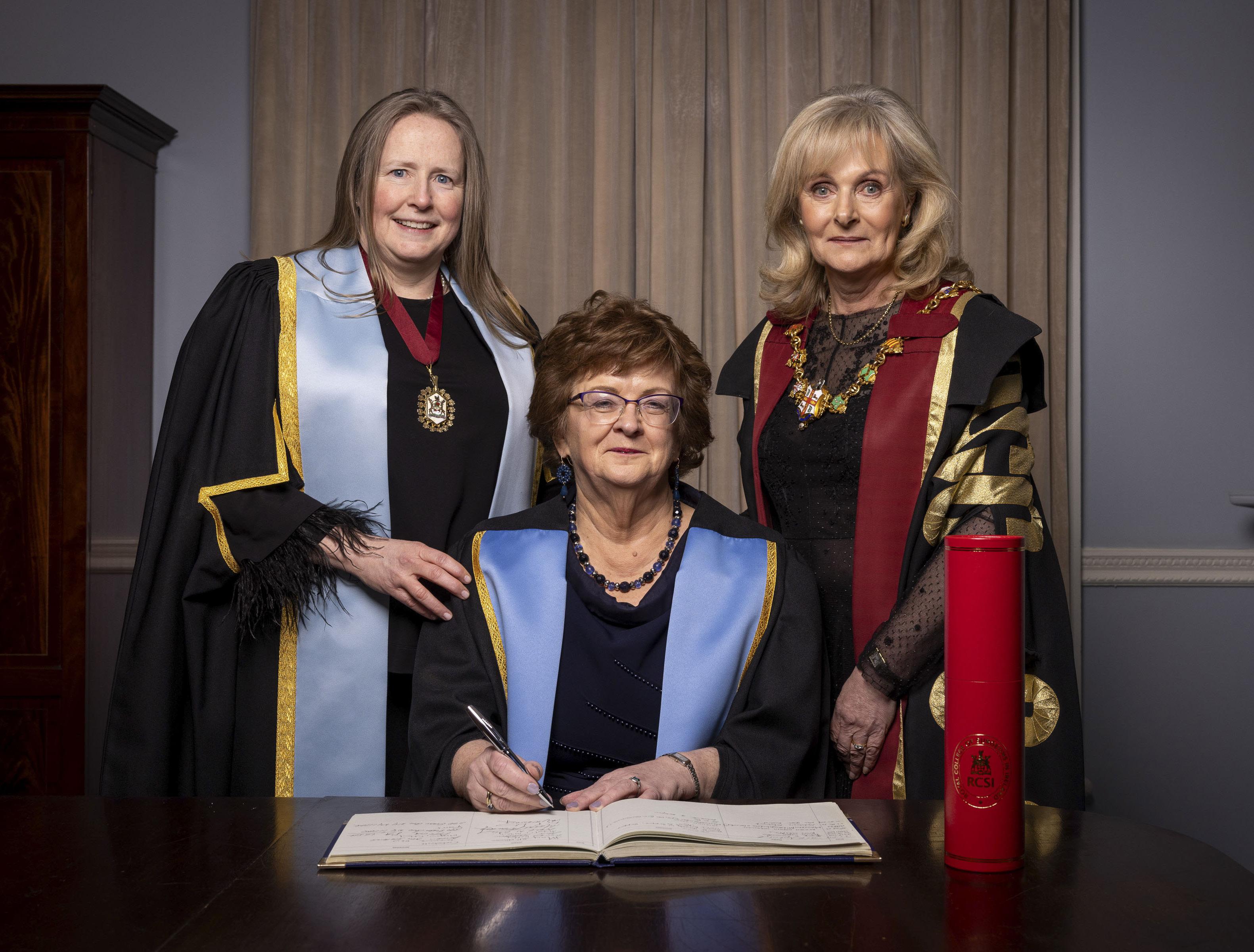 Pictured at RCSI Charter Day 2024 were Professor Deborah McNamara, Vice-President; Professor Hannah McGee, Deputy Vice Chancellor for Academic Affairs, who was awarded an Honorary Fellowship in recognition of her outstanding contribution to RCSI; and Professor Laura Viani, RCSI President.