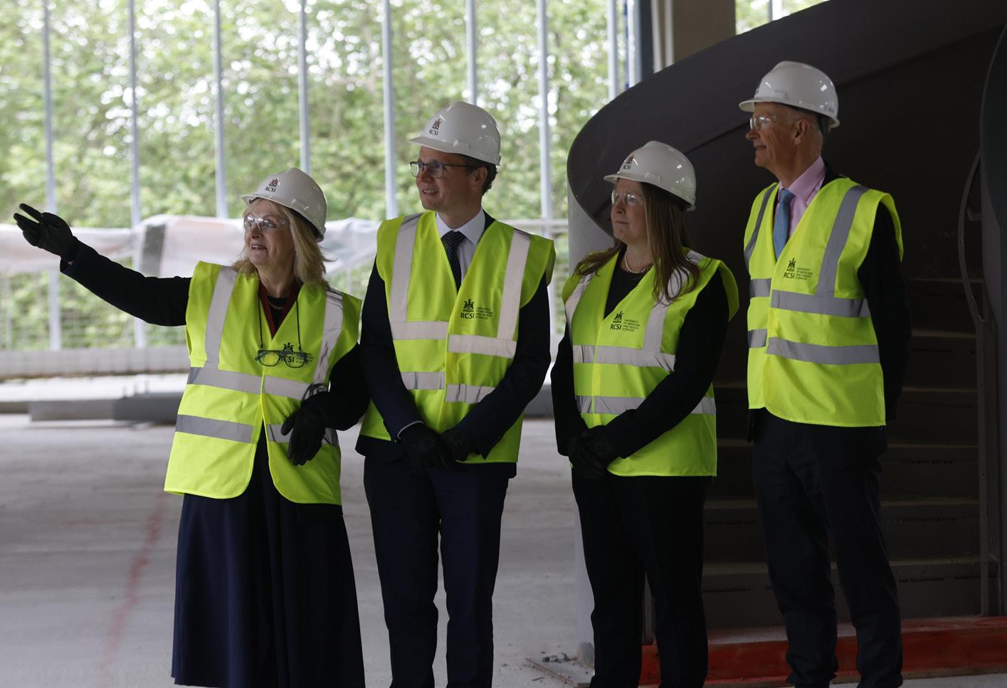 Professor Laura Viani, President; Minister Patrick O’Donovan TD, Minister for Further and Higher Education, Research, Innovation and Science; Professor Deborah McNamara, Vice-President; and Professor Cathal Kelly, Vice Chancellor and Chief Executive, pictured at the ‘topping out’ of RCSI’s new education, research and engagement building at 118 St Stephen’s Green, marking a major milestone in the €95 million campus expansion project.