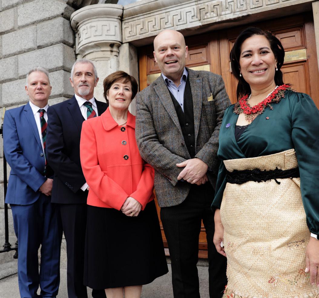 An tOllamh Carmel Malone, Ball den Chomhairle; an Dr Clifford Y. Ko, faighteoir na Comhaltachta Oinigh; an tOllamh Deborah McNamara, Uachtarán; an tOllamh Rowan Parks, faighteoir na Comhaltachta Oinigh agus Bridget Egan, Ball den Chomhairle, sa phictiúr roimh shearmanas bronnta na gComhaltachtaí Oinigh ag ceiliúradh Sheachtain na Cairte i mí Feabhra.