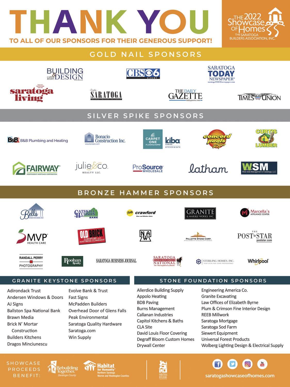 On behalf of the Saratoga Builders Association and the Showcase Committee, I’d like to thank all the corporate and media sponsors for their generous support. Special thanks to all our talented builders for their commitment to this popular, long running show. Applause to the countless volunteers who staff the homes to help provide for a truly memorable experience. Lastly, we are so very grateful for the tremendous public support through ticket sales - each and every year.