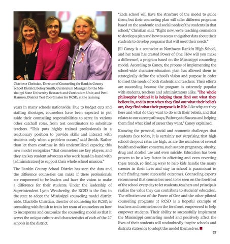 years in many schools nationwide. Due to budget cuts and staffing shortages, counselors have been expected to put aside their counseling responsibilities to serve in various other catchall roles, from test coordinators to substitute teachers. “This puts highly trained professionals in a reactionary position to provide skills and interact with students only when a problem occurs,” said Smith. Rather than let them continue in this underutilized capacity, this new model recognizes “that counselors are key players, and they are key student advocates who work hand-in-hand with [administrators] to support their whole school mission.” The Rankin County School District has seen the data and the difference counselors can make if these professionals are empowered to be leaders and have the vision to make a difference for their students. Under the leadership of Superintendent Lynn Weathersby, the RCSD is the first in the state to adopt the Mississippi counseling model district wide. Charlotte Christian, director of counseling for RCSD, is consulting with Smith to train her team of counselors on how to incorporate and customize the counseling model so that it serves the unique culture and characteristics of each of the 27 schools in the district.