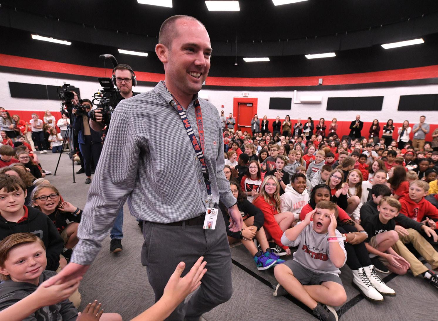 PUES students give high-fives to Shows after he was named a Milken Educator Award recipient in a surprise ceremony at the school. (Photo courtesy of Milken Family
