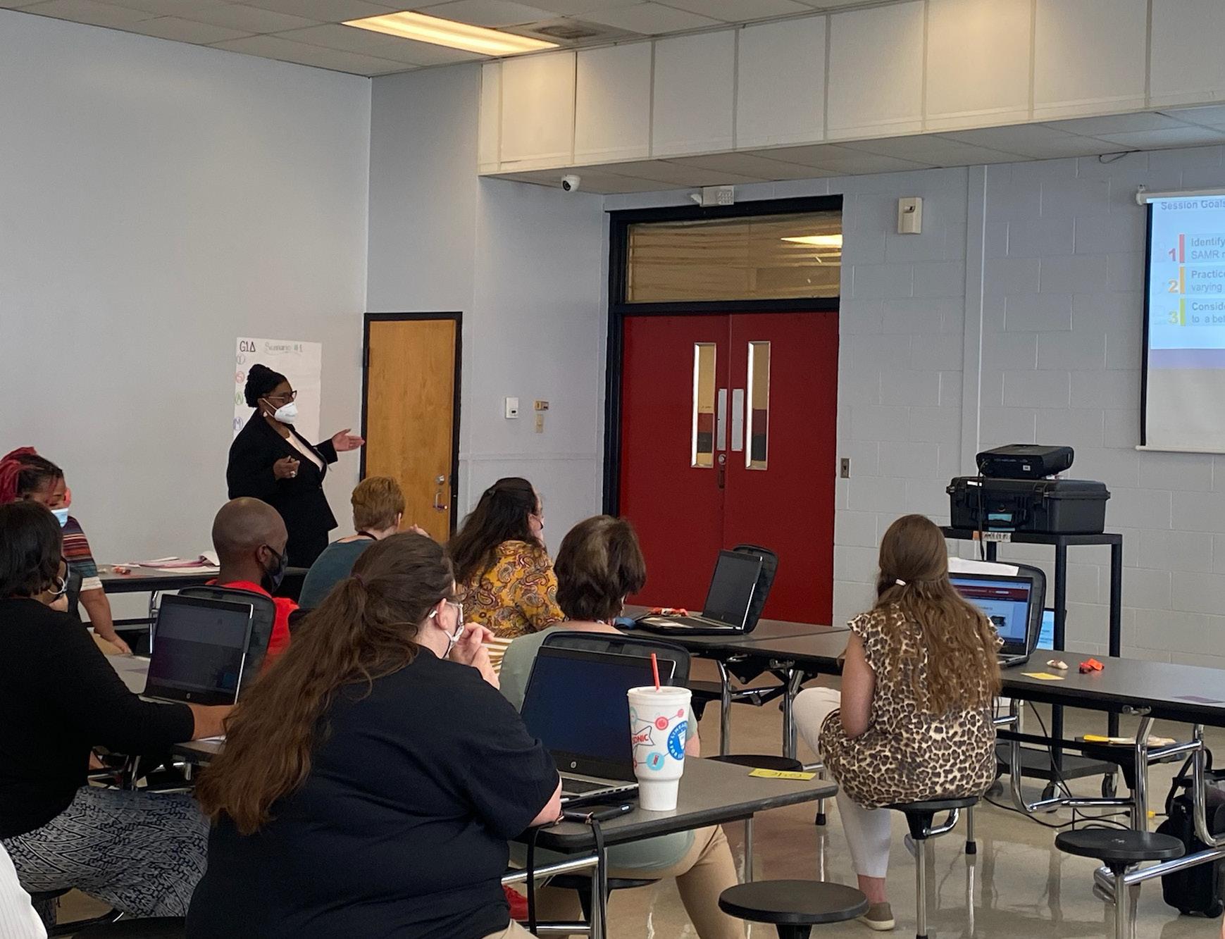 Opposite page: Lillie Sweazy, a digital learning coach with the Mississippi Department of Education (MDE), trains Lawrence County School District educators on the best practices of virtual instruction. At the start of the 2021-2022 academic year, MDE deployed digital learning coaches to almost 30 school districts to help teachers transition to online instructional environments through the Mississippi Connects initiative.
