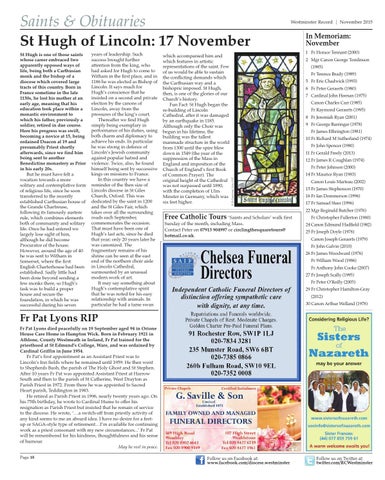 Fr Pat Lyons RIP Fr Pat Lyons died peacefully on 19 September aged 94 in Orione House Care Home in Hampton Wick. Born in February 1921 in Athlone, County Westmeath in Ireland, Fr Pat trained for the priesthood at St Edmund’s College, Ware, and was ordained by Cardinal Griffin in June 1954. Fr Pat’s first appointment as an Assistant Priest was to Lincoln’s Inn fields where he remained until 1959. He then went to Shepherds Bush, the parish of The Holy Ghost and St Stephen. After 10 years Fr Pat was appointed Assistant Priest at Harrow South and then to the parish of St Catherine, West Drayton as Parish Priest in 1972. From there he was appointed to Sacred Heart parish, Teddington in 1983. He retired as Parish Priest in 1996, nearly twenty years ago. On his 75th birthday, he wrote to Cardinal Hume to offer his resignation as Parish Priest but insisted that he remain of service to the diocese. He wrote, ‘…a switch-off from priestly activity of any kind seems to me an absurd idea. I have no desire for a feetup or SAGA-style type of retirement…I’m available for continuing work as a priest consonant with my new circumstances...’ Fr Pat will be remembered for his kindness, thoughtfulness and his sense of humour. May he rest in peace. Page 18