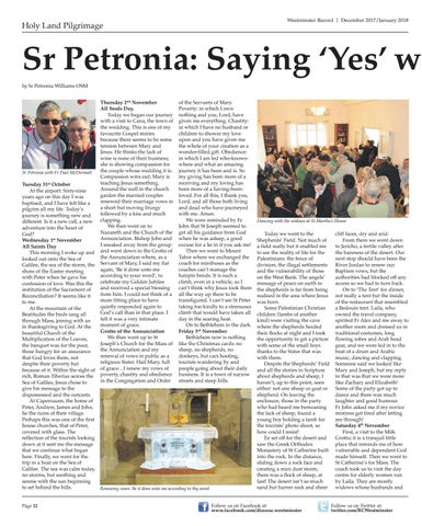 Tuesday 31st October At the airport: Sixty-nine years ago on this day I was baptised, and I have felt like a pilgrim all my life. Today’s journey is something new and different. Is it a new call, a new adventure into the heart of God? Wednesday 1st November All Saints Day This morning I woke up and looked out onto the Sea of Galilee, the sea of the storm, the shore of the Easter meeting with Peter when he gave his confession of love. Was this the institution of the Sacrament of Reconciliation? It seems like it to me. At the mountain of the Beatitudes the birds sang all through Mass, joining with us in thanksgiving to God. At the beautiful Church of the Multiplication of the Loaves, the banquet was for the poor, those hungry for an assurance that God loves them, not despite their poverty but because of it. Within the sight of rich, Roman Tiberius across the Sea of Galilee, Jesus chose to give his message to the dispossessed and the outcasts. At Capernaum, the home of Peter, Andrew, James and John, lie the ruins of their village. Perhaps this was one of the first house churches, that of Peter, covered with glass. The reflection of the tourists looking down at it sent me the message that we continue what began here. Finally, we went for the trip in a boat on the Sea of Galilee. The sea was calm today, no storms, but soothing and serene with the sun beginning to set behind the hills. Renewing vows: Be it done unto me according to thy word. Page 12
