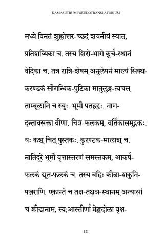 ु ोत्तर-च्छदं र्यिीयं स्यात. ् म्े नवितं र्क्ल प्रनतर्निका च. तस्य नर्रो-भागे कू चा-िािं ् िे ु पिं माल्यं नसक्थवेनदका च. ति रानि-र्ेषम अि ु ङ्ग-त्वचस ् ु करण्डकं सौगनन्धक-पनटका मातलु ू ानि च स्यिःु . भूमौ पतद्ग्रहिः. िागताम्बि ु दन्तावसक्ता वीणा. नचि-फिकम. ् वनताकासमद्गकिः. ् ् ु यिः कर् नचत प् स्तकिः. कुरण्टक-मािार् च. िानतदूरे भूमौ वृत्तास्तरणं समस्तकम. ् आकषाफिकं द्यूत-फिकं च. तस्य बनहिः क्रीडा-र्कुनि् पञ्जरानण. एकान्ते च तक्ष-तक्षञ-िािम अन्यासां ् च क्रीडािाम. ् स्व:आस्तीणाा प्रेङ्खदोिा वृक्ष121